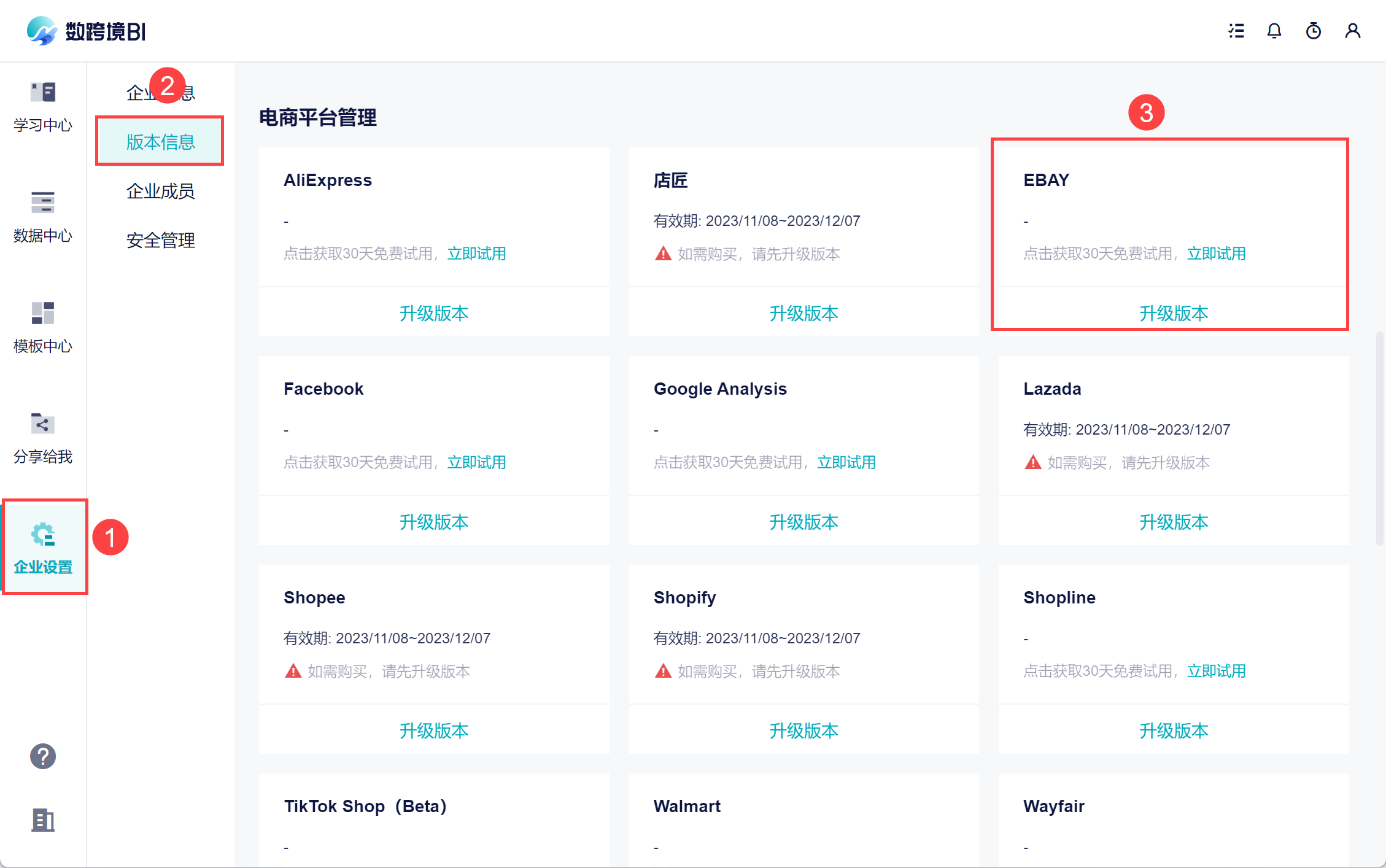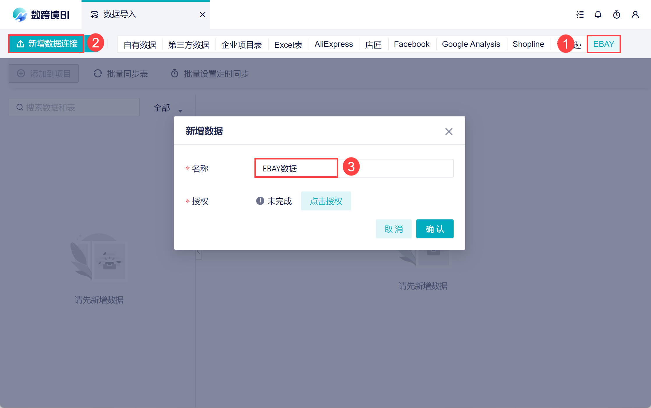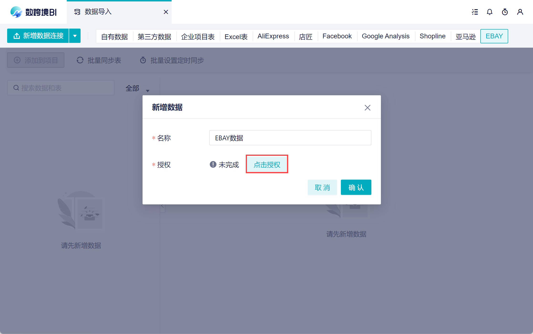 「 EBAY」为付费数据源,请管理员开通使用或者购买该数据源。如下图所示: