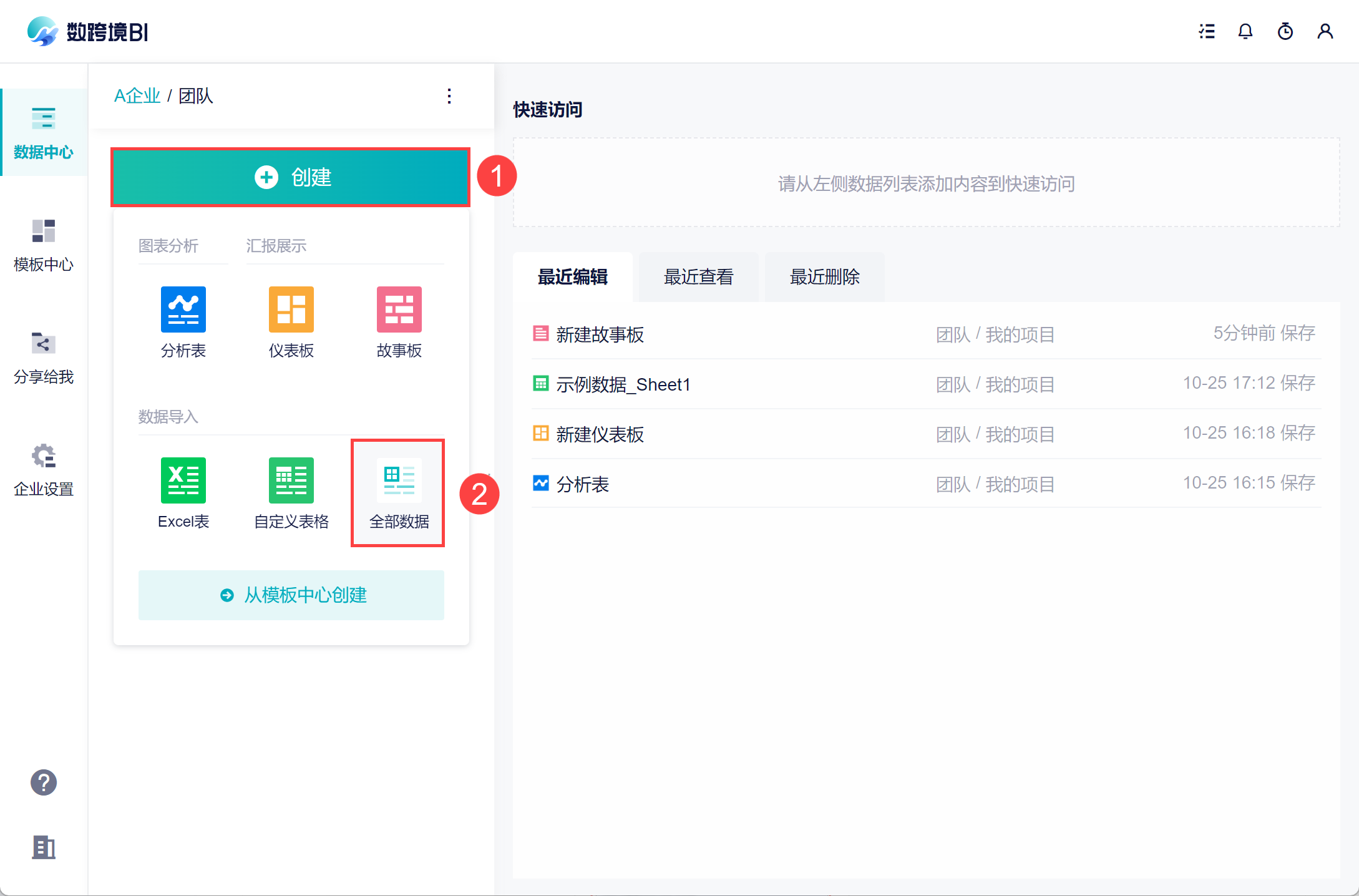 1)选择进入某一个团队,点击「创建>全部数据」进入数据源界面。如下图所示: