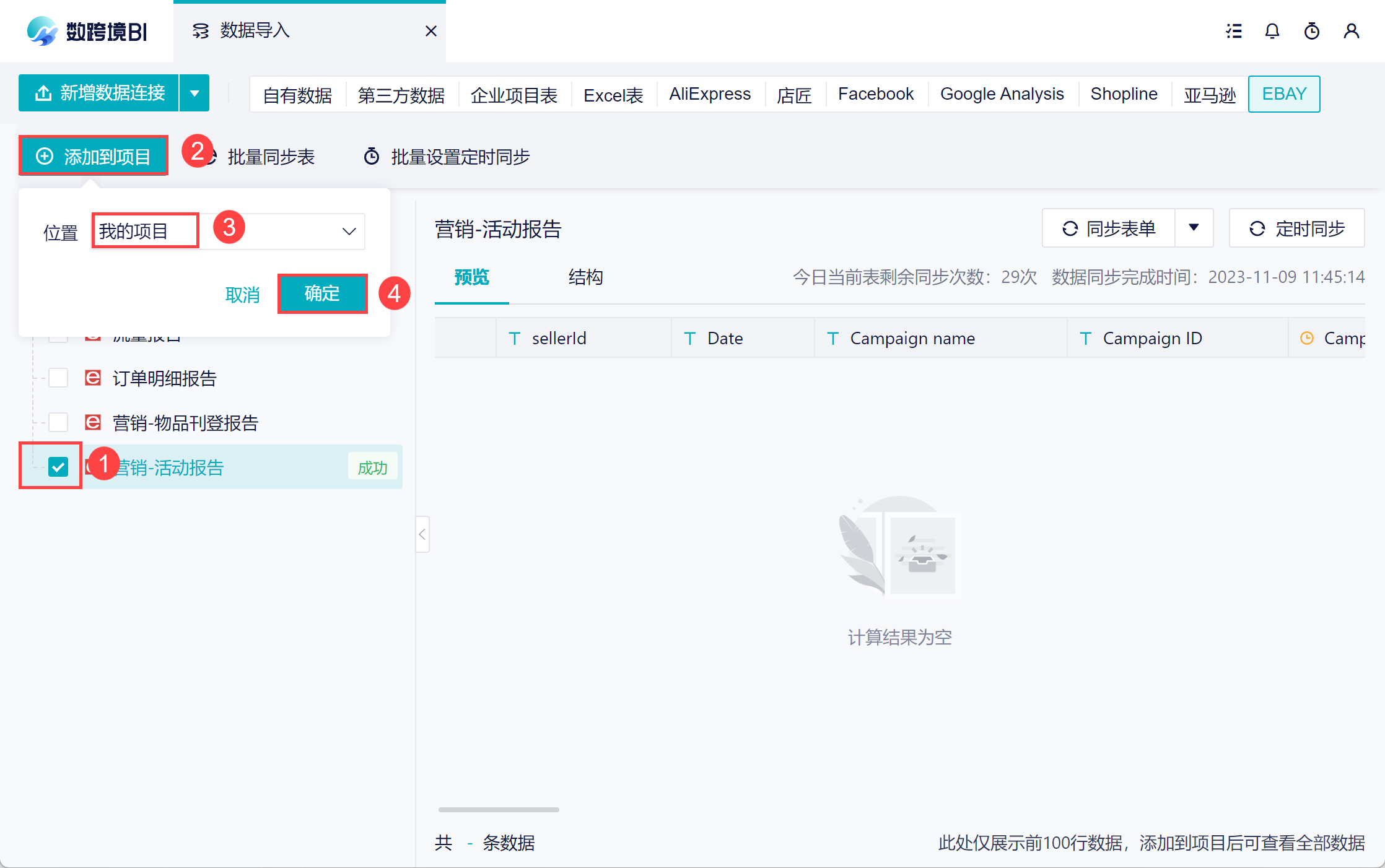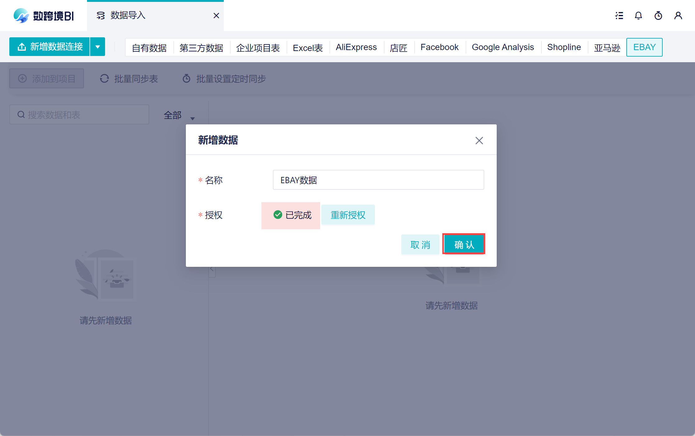 本次操作是手动全量同步,数跨境还支持批量同步,定时同步等,详情参见文档:同步数据源。