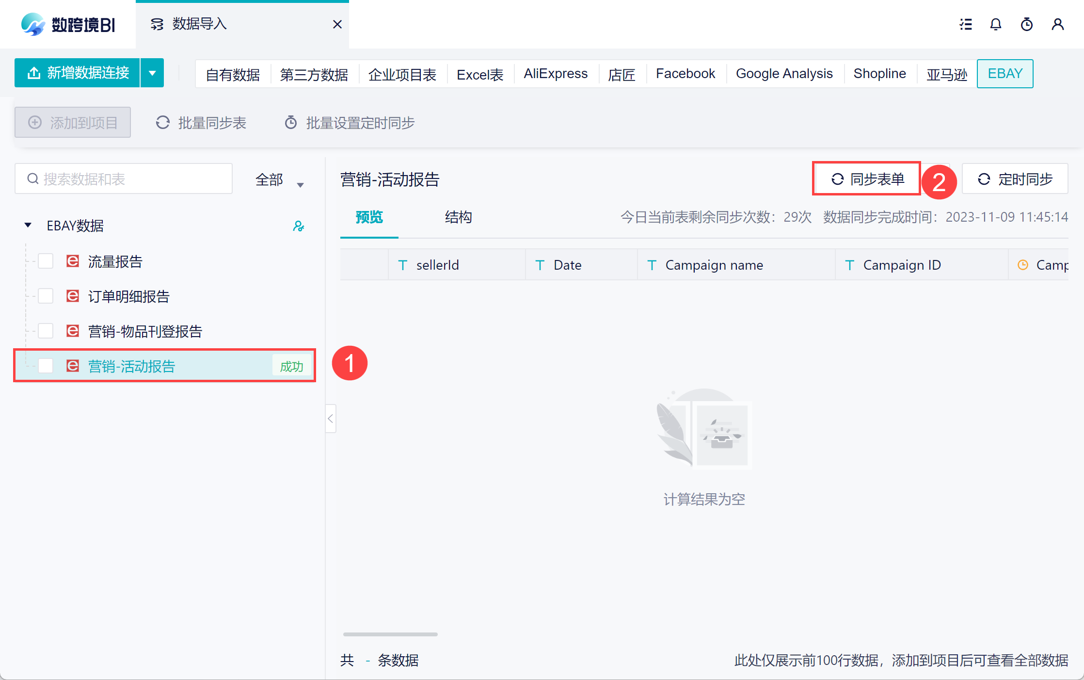 1)完成授权后,在左侧就获取了数据列表。此时还没有数据,可以先点击「同步数据源」先将数据全量同步一次。