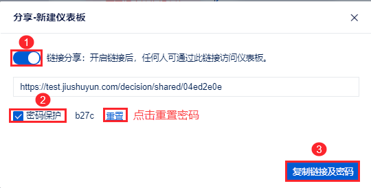 若想点击链接直接查看仪表板,则打开分享按钮,并点击「复制链接」。如下图所示: