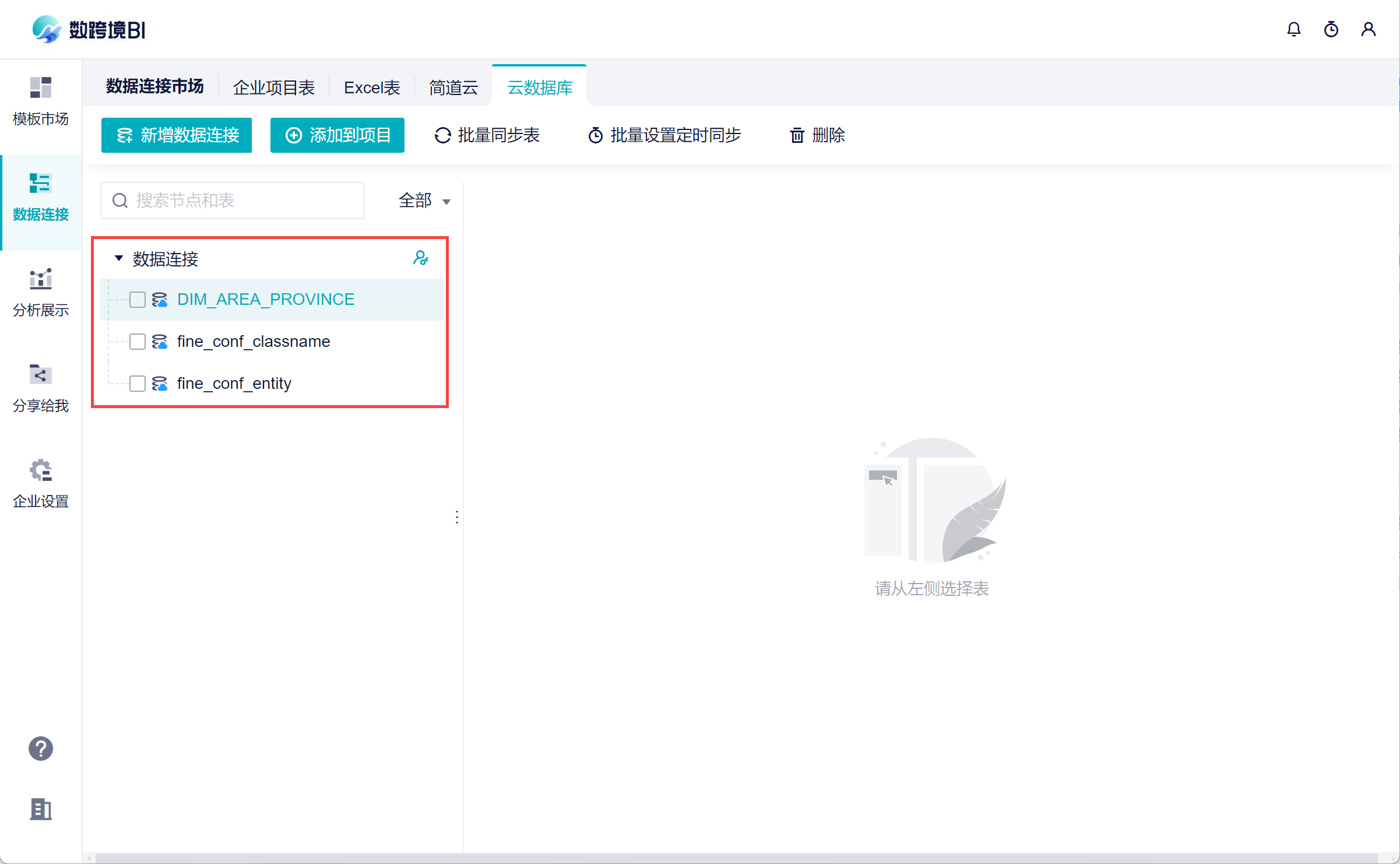 这里仅展示已添加到数跨境中的数据表,未添加过的表是不会展示在数据源界面的。请重复添加表操作,将数据库中的表添加到数跨境中。