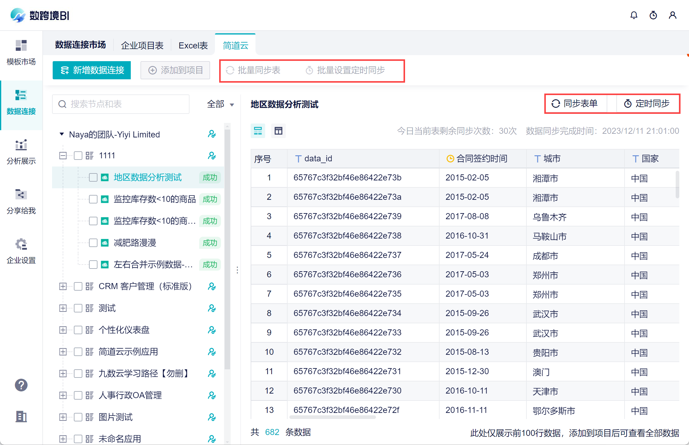 授权成功后,即可将对应数据表同步更新至九数云平台,你可以对数据进行同步更新的设置。可以对整个数据源或某些表进行手动或者定时同步。详情参见:同步数据源