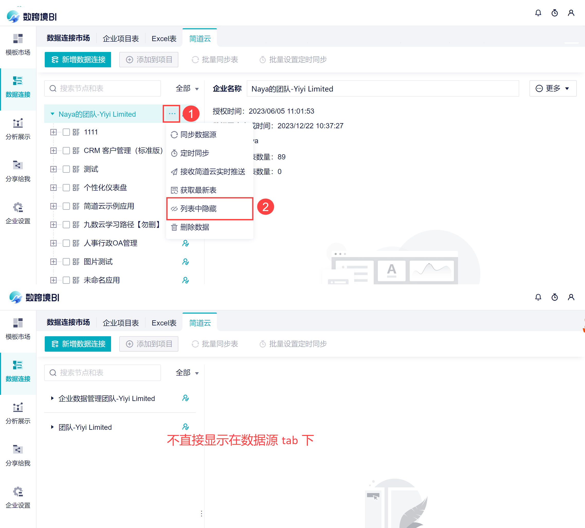 在数据连接中,可以查看所有有权限的数据。可能数据源太多,你不想查看。那么,可以将数据源隐藏,该数据源就不会直接出现在 tab 下。