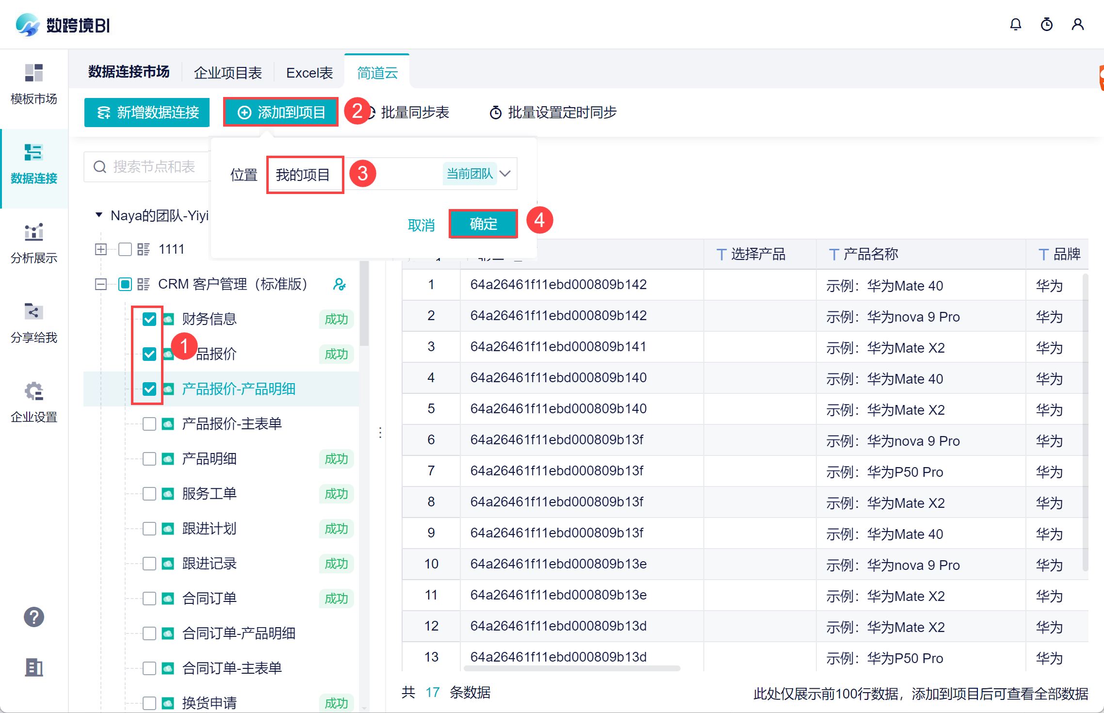 获取到数据表后,需要将数据保存在「分析展示」模块的项目中,进一步地分析。