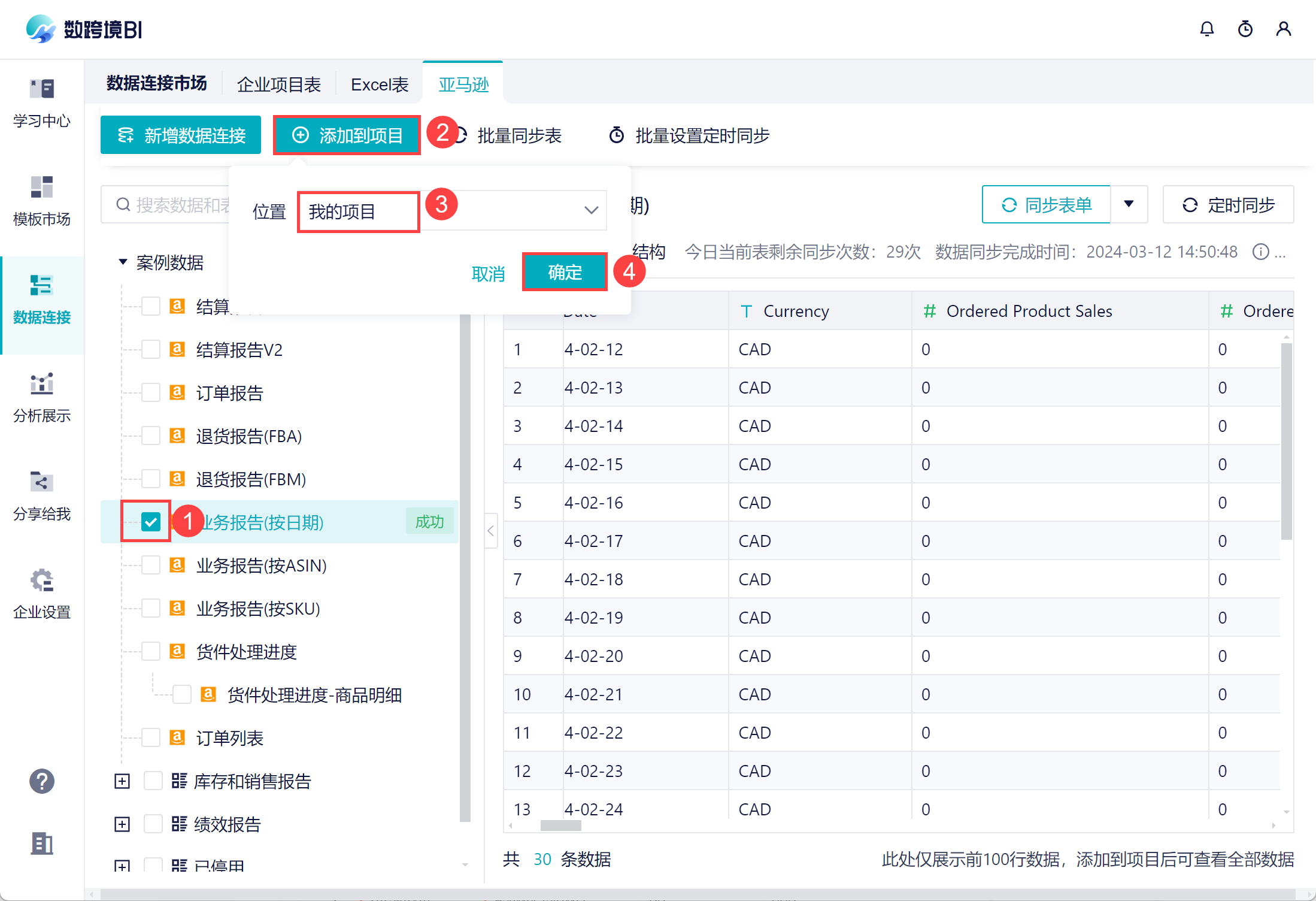 1)选择「业务报告(按日期)」这张数据表,点击「添加到项目」,选择好位置后,点击「确定」。如下图所示: