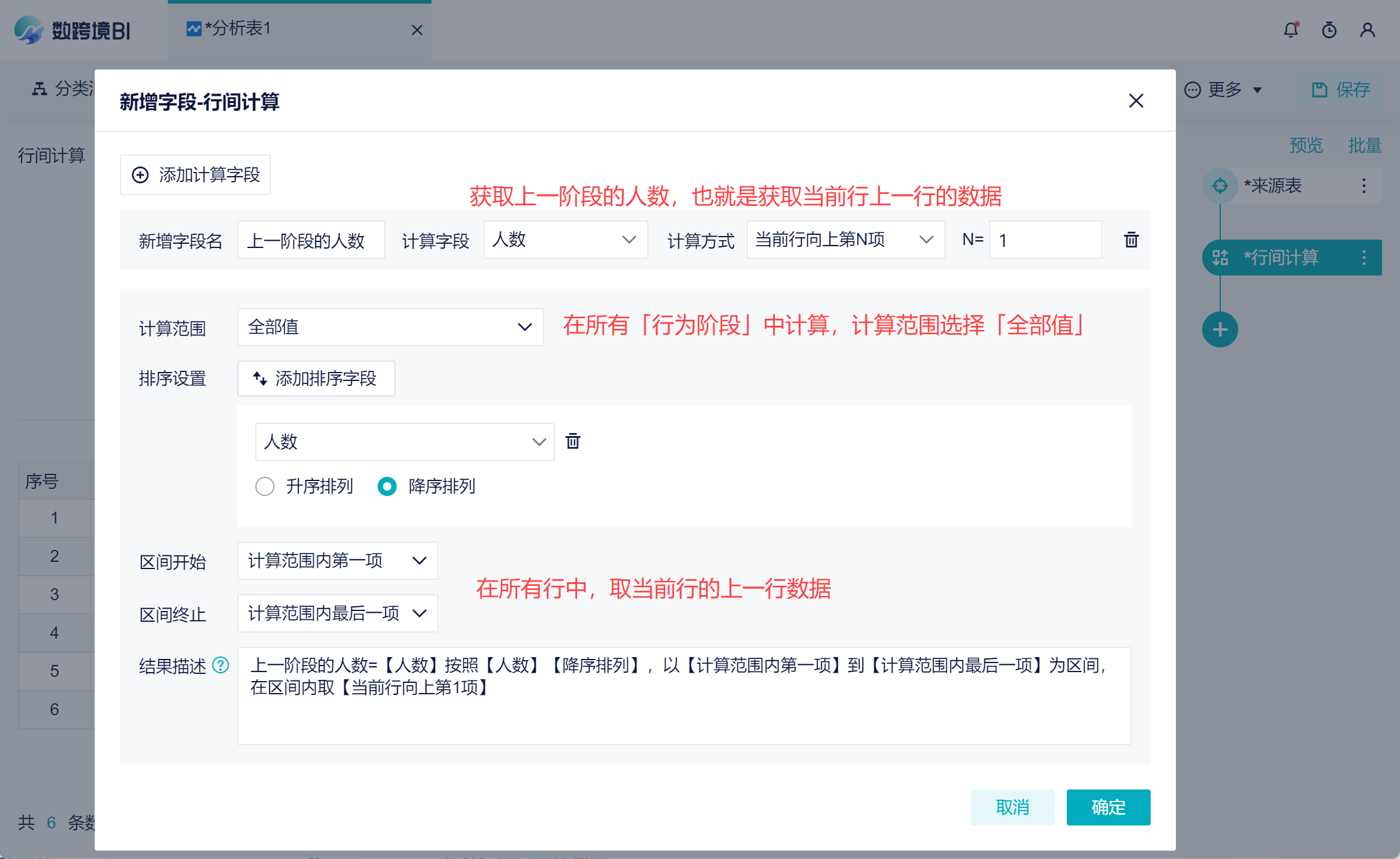 3)在弹窗中进行相关的配置,可以获取当前行上一行的数据。同理,可以获取当前行前 2 行的数据、前 3 行的数据......