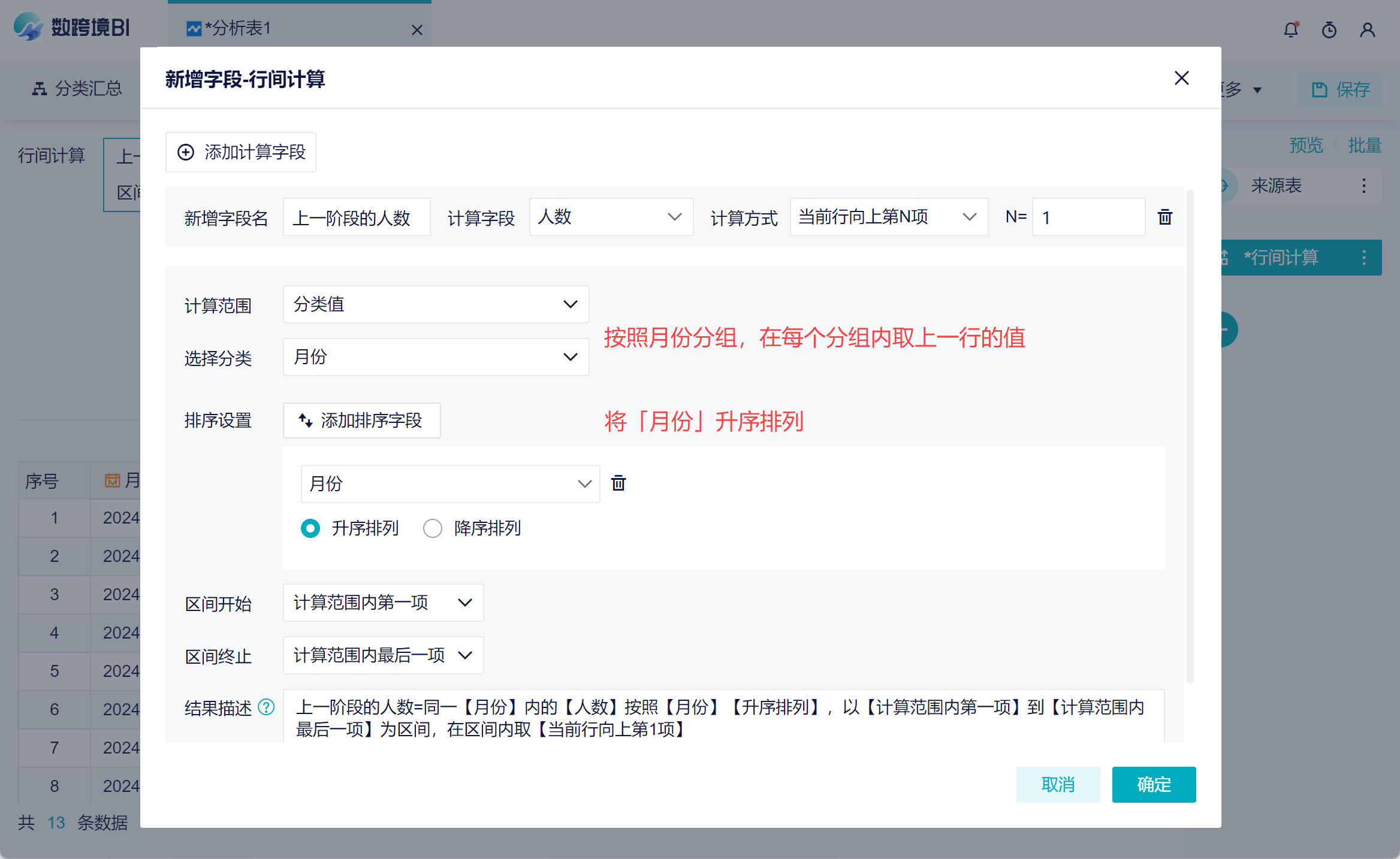 2)在弹窗中,将「计算范围」改为分类值,并按照「月份」分组。那么就是在每月分组内,寻找上一行的数据。如下图所示: