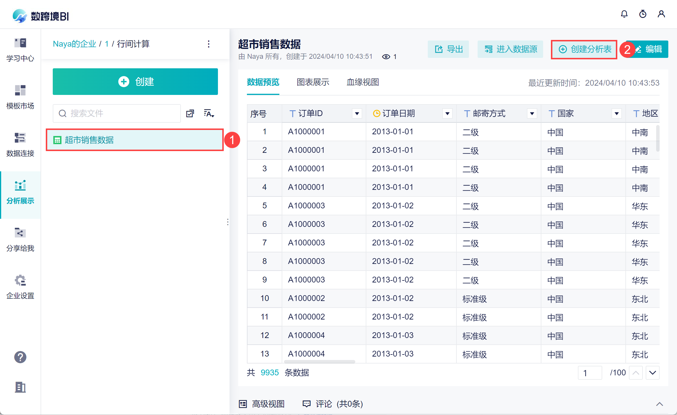 1)下载示例数据并上传到数跨境中,将数据保存在项目中,创建一张分析表。如下图所示: