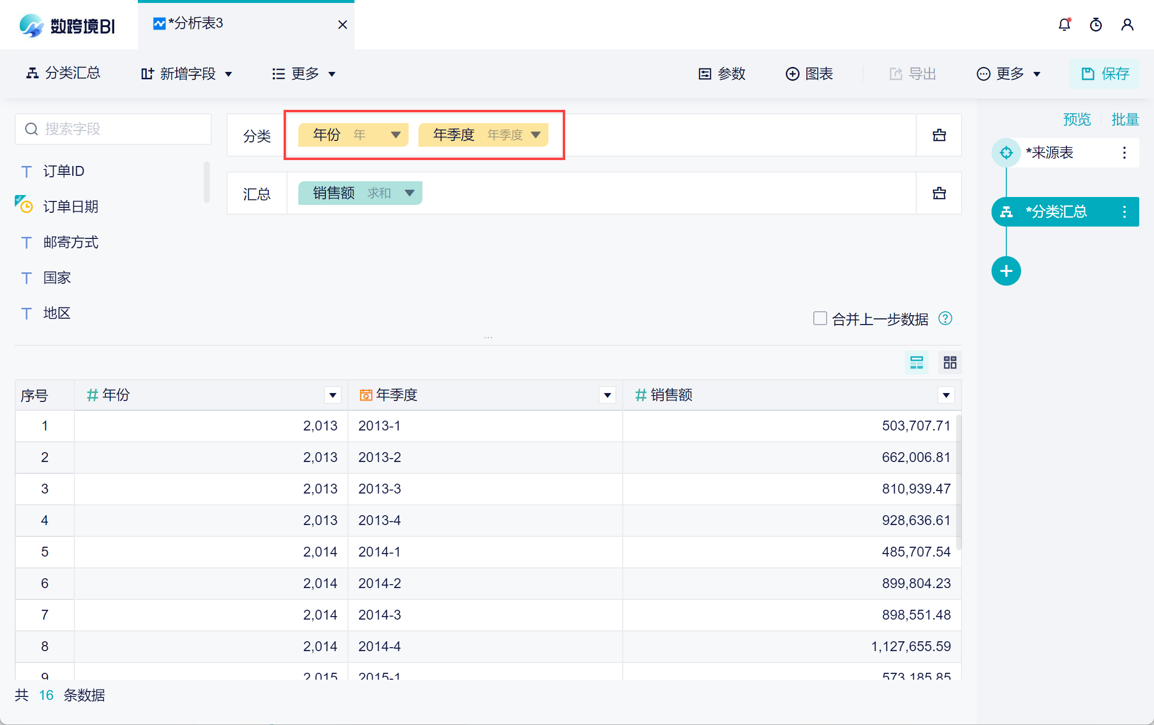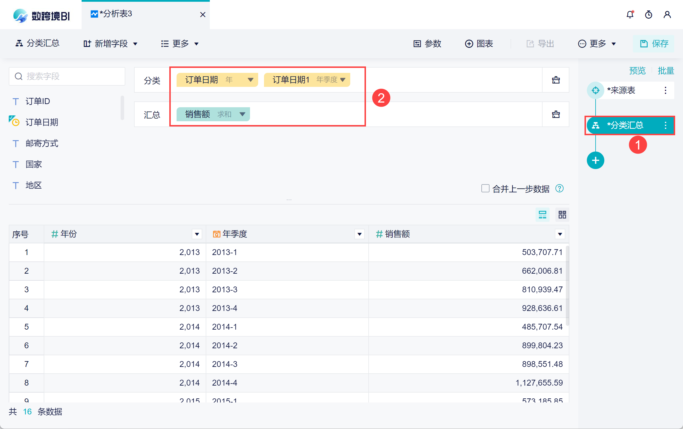 2)添加一个「分类汇总」步骤,在分类栏中拖入两个「订单日期」字段,并分别更改按「年」分组、按「年季度」分组;在汇总栏中拖入「销售额」字段,这样可以计算出每年每个季度的销售额总和。如下图所示: