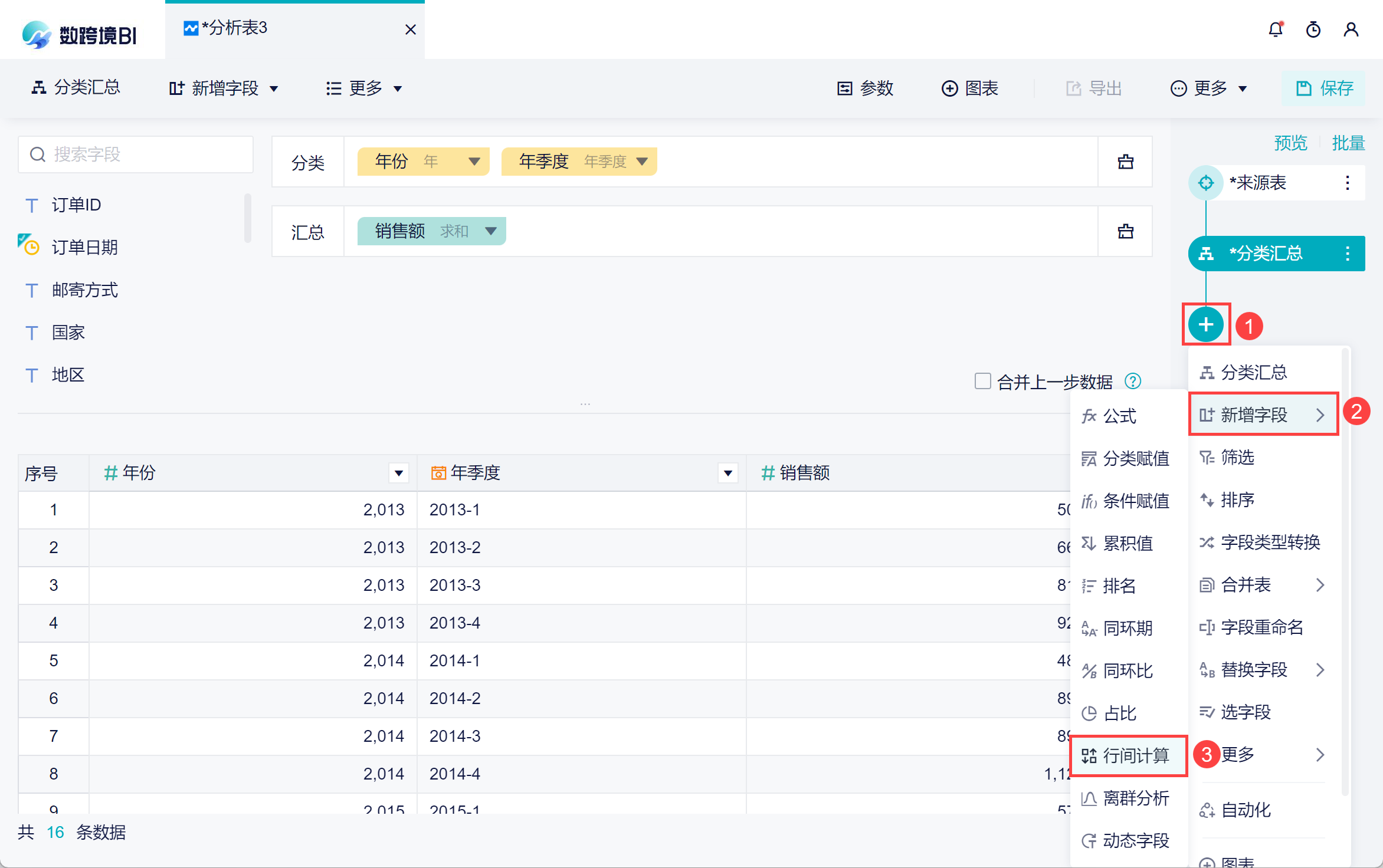 4)下面获取每年第一个季度的销售额,点击「+>新增字段>行间计算」。如下图所示: