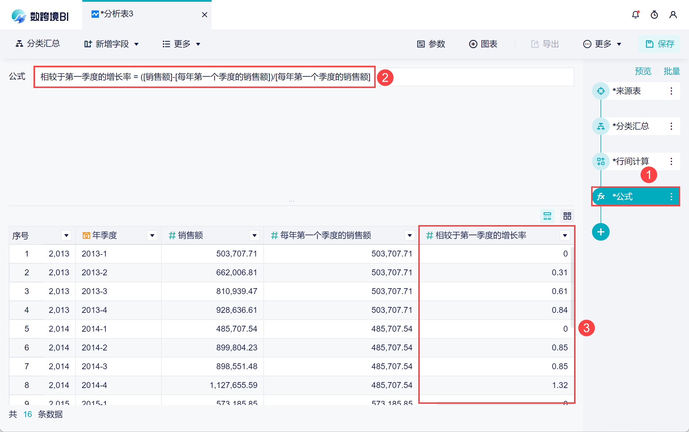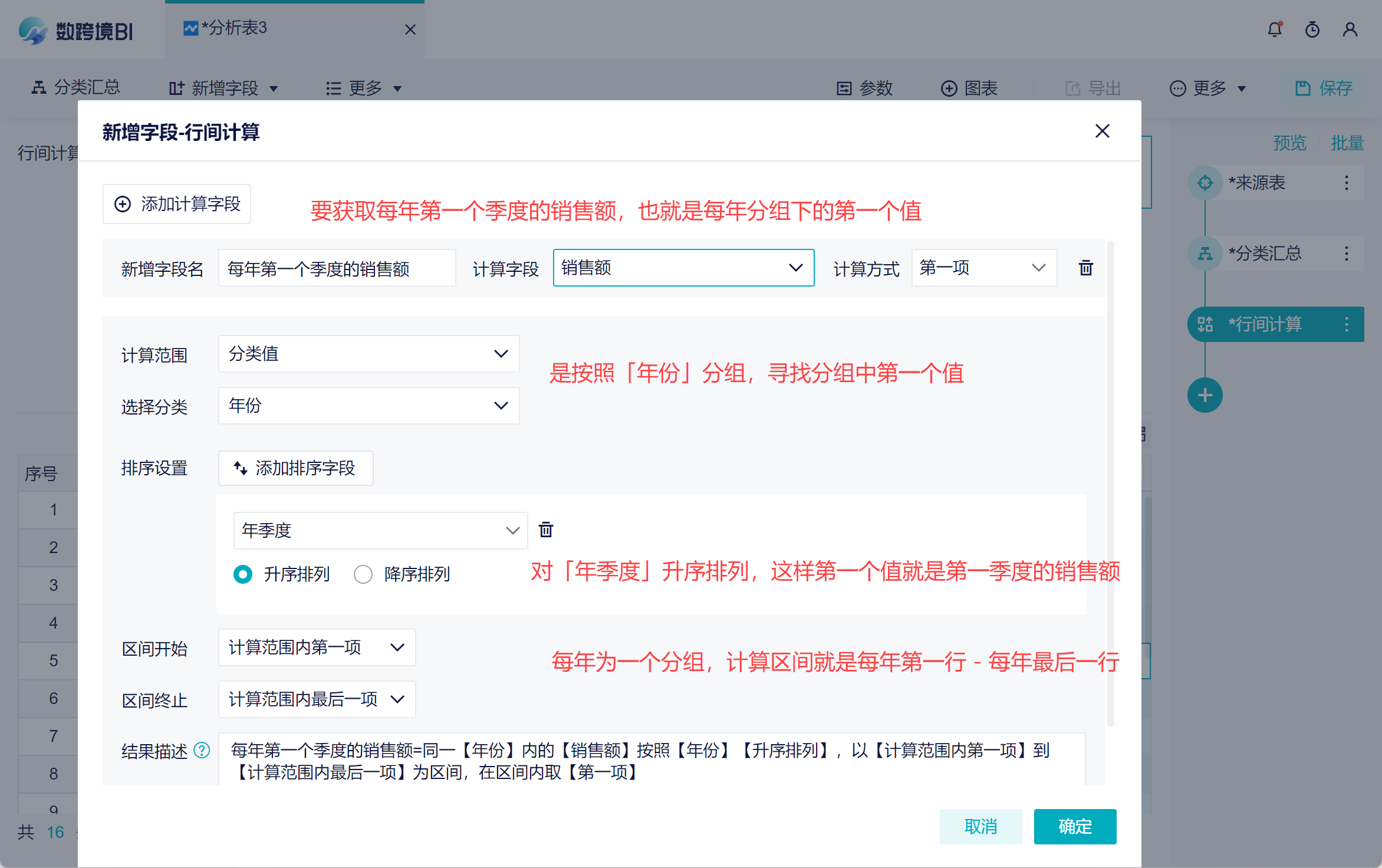 1)先使用「行间计算」功能,获取到每年第一个值,也就是第一个季度的销售额;