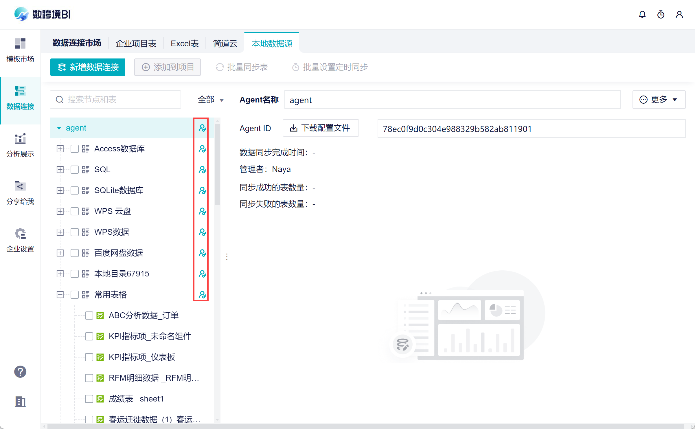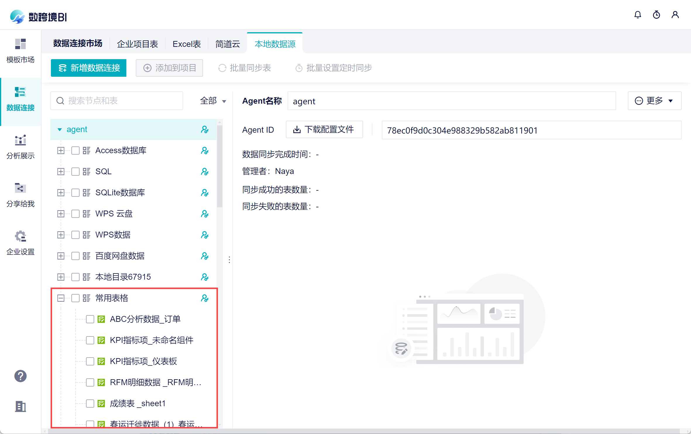 而使用 agent 客户端,可以直接连接本地电脑文件夹,获取文件夹中的 Excel 表、csv 表。当本地文件夹中的表数据发生变化,agent可以自动获取更新。