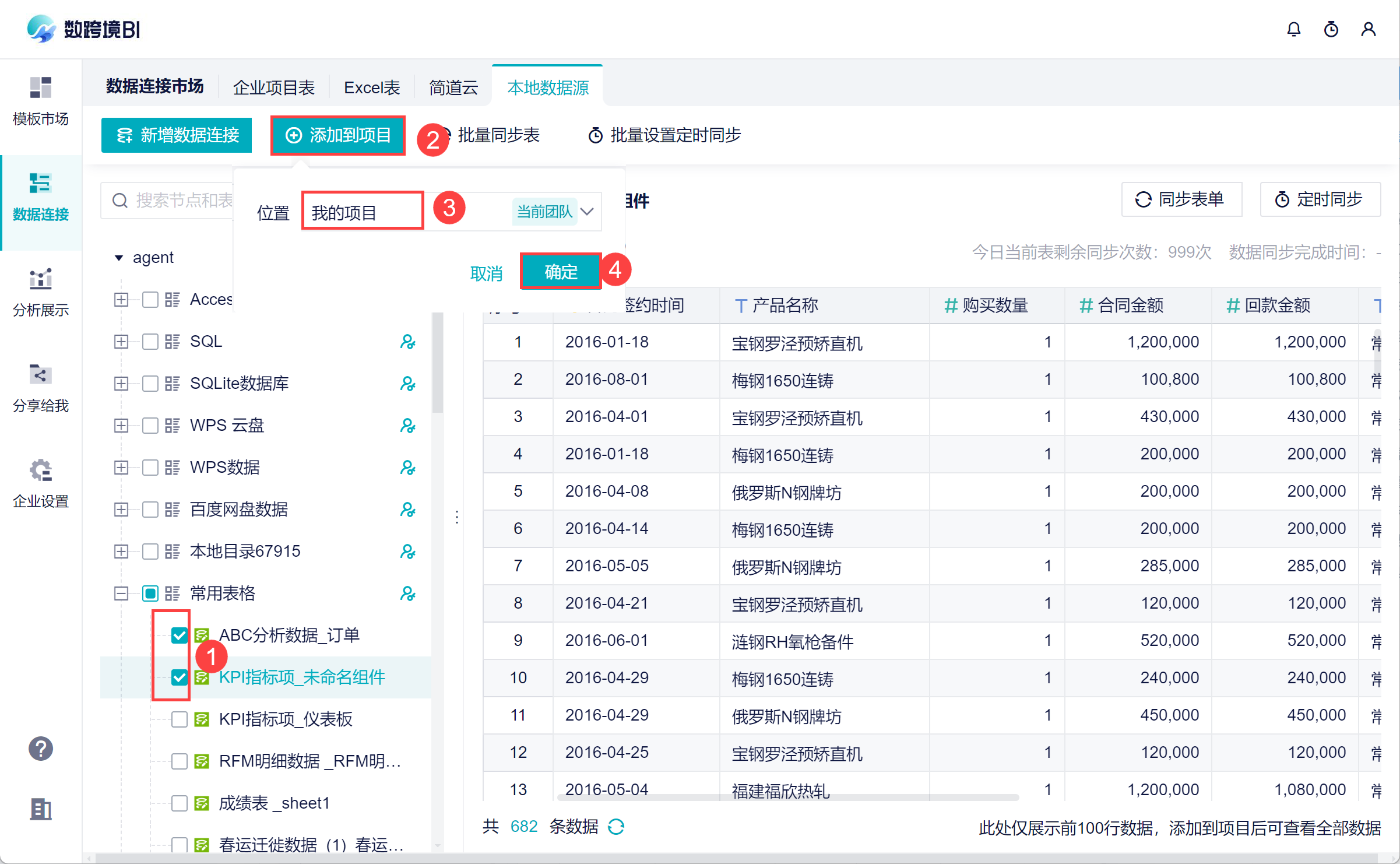连接好数据源并同步数据后,下一步,需要将数据保存在「分析展示」模块的项目中,进一步地分析。