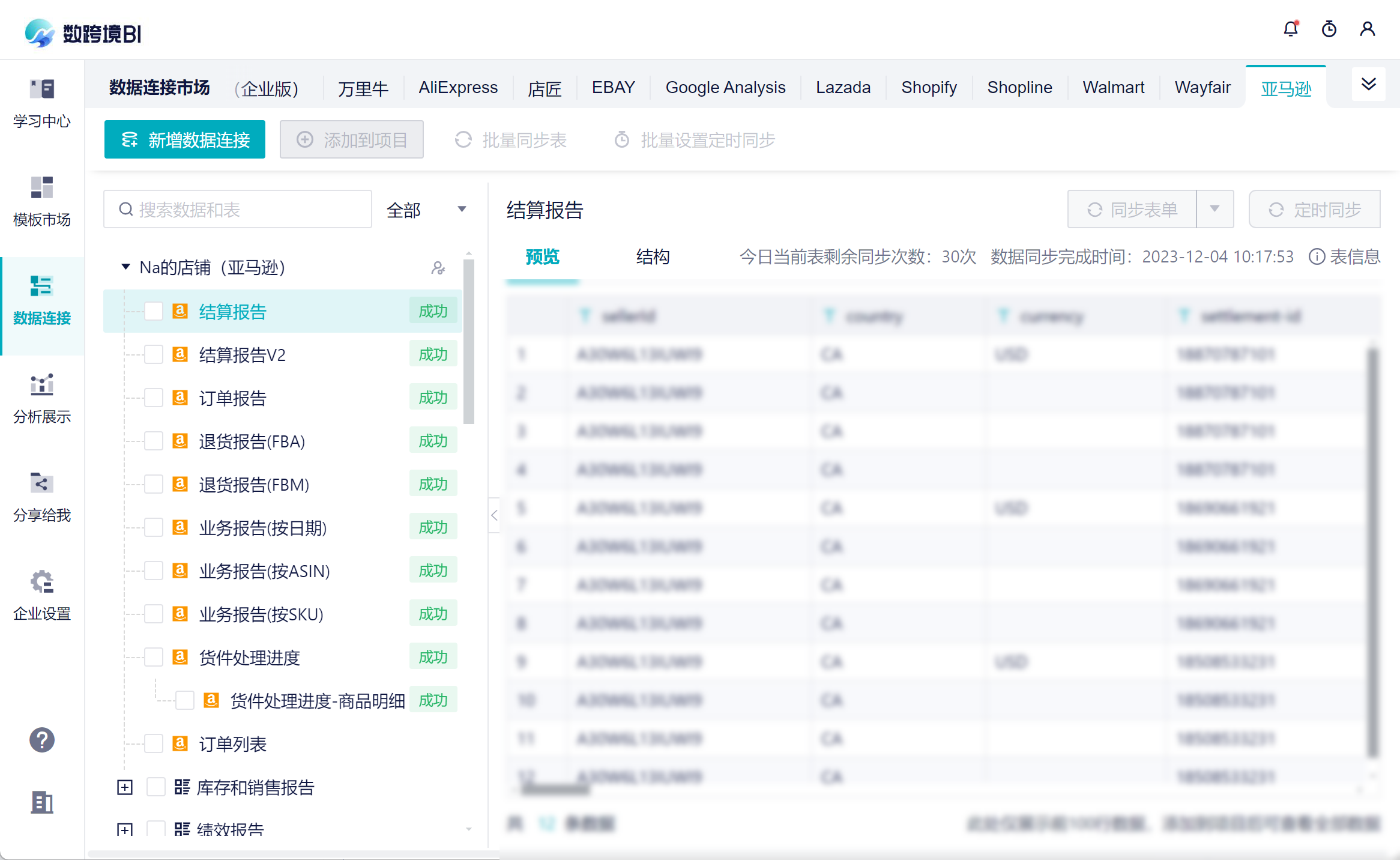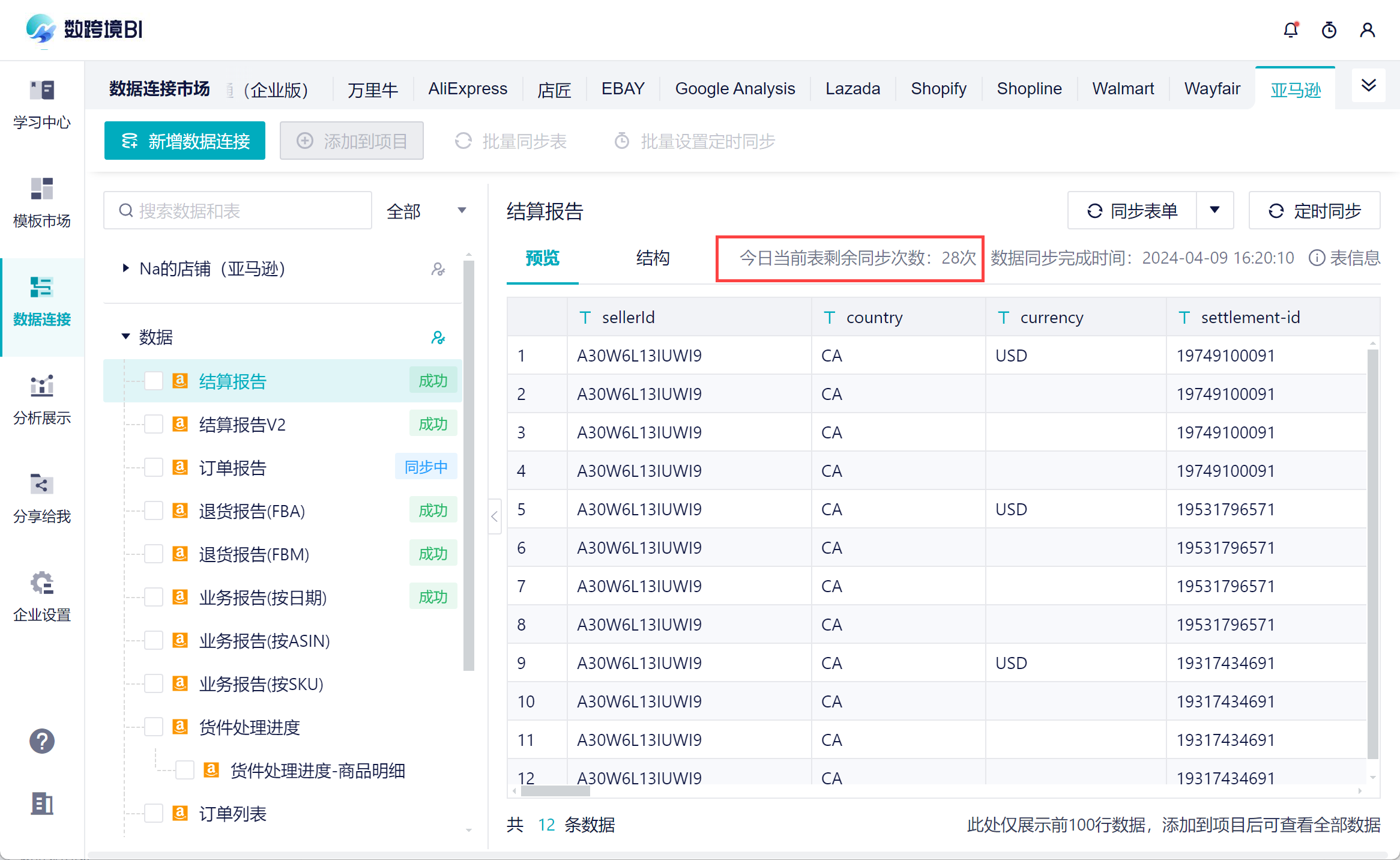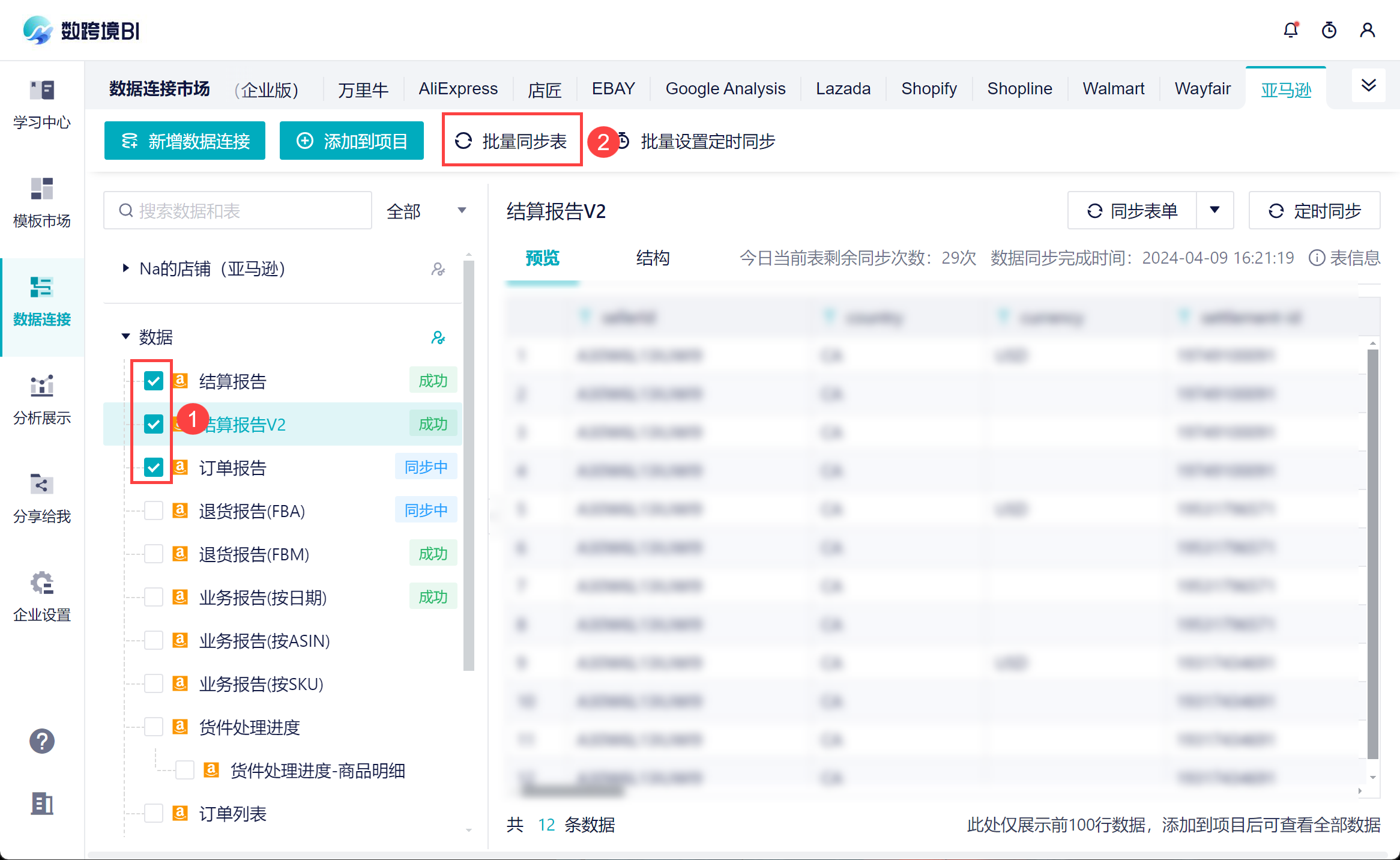 若数据源中有多个表数据都发生了变化,想要同步新的数据至数跨境,可以使用批量同步表/批量设置定时同步,就可以一次性同步多表。