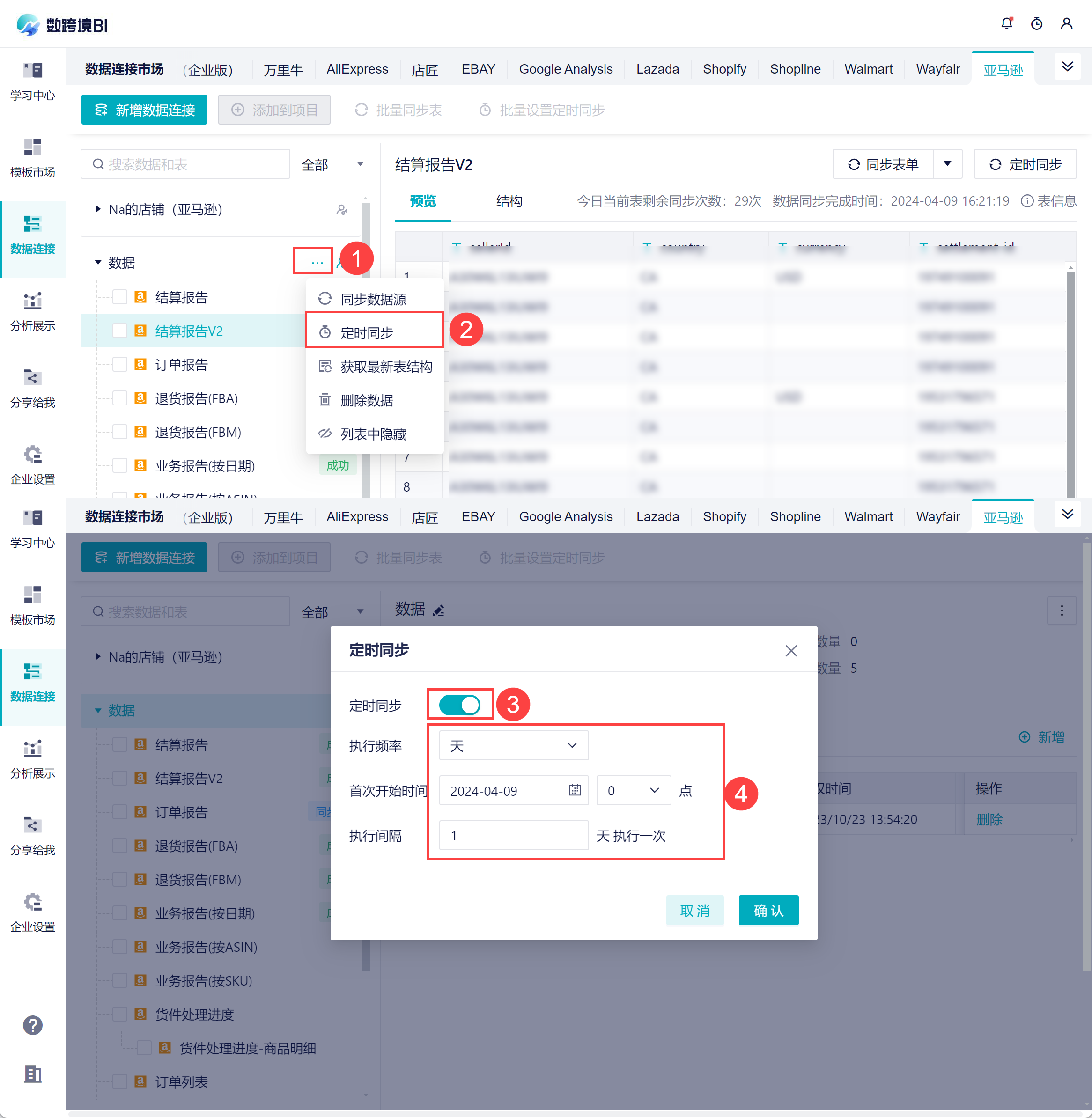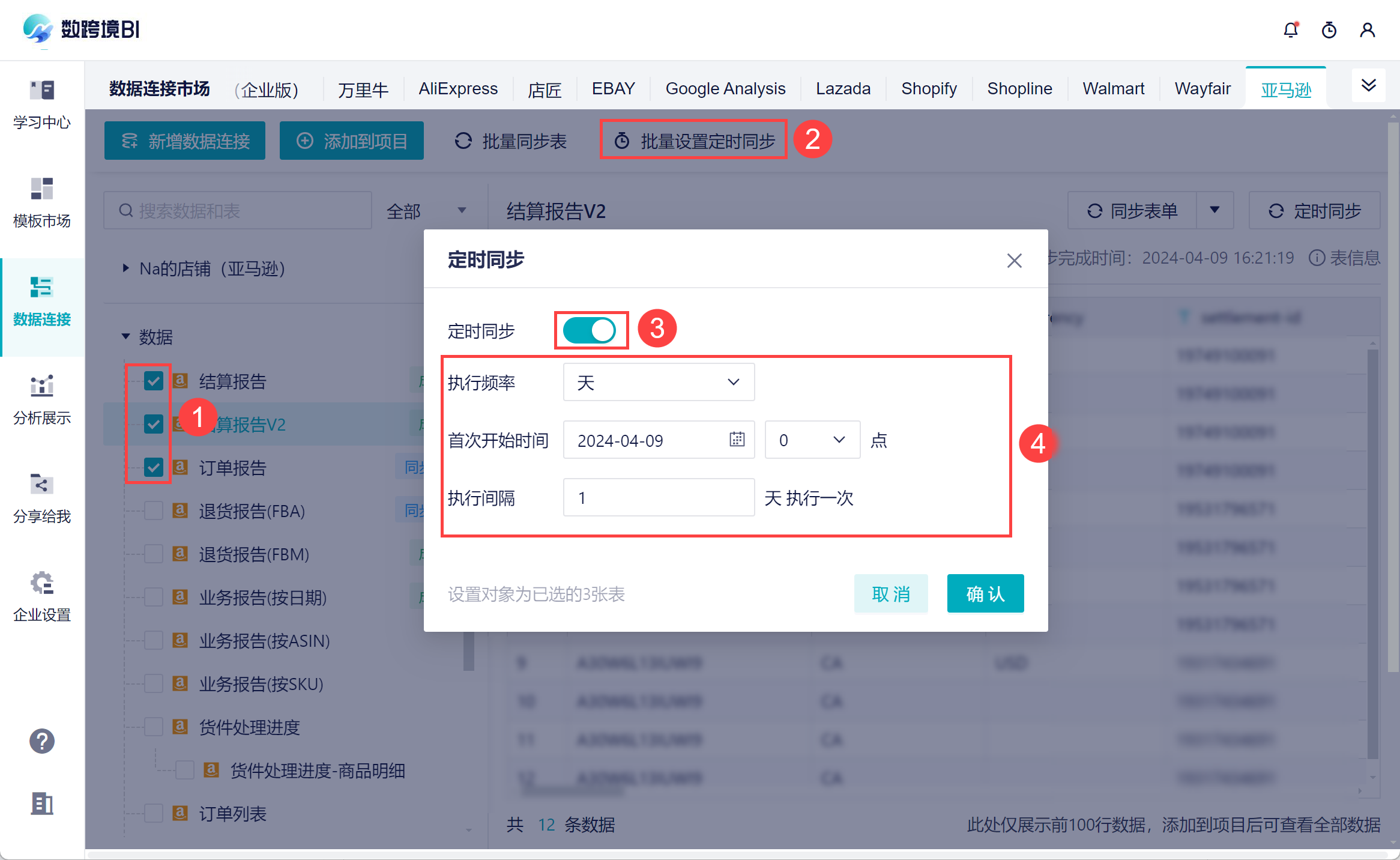 若多张表数据每天都是定时更新,希望也能定时同步至数跨境,可以对多张表批量设置定时同步。