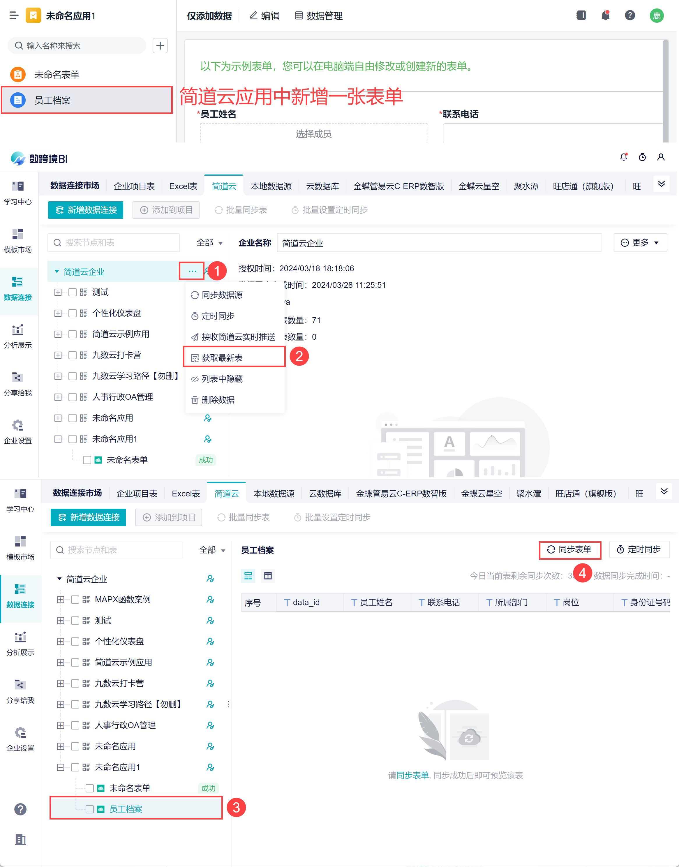 若简道云中有一张新增表单,先使用「获取最新表」功能同步新的数据列表,将获取这张表的字段,但是不获取数据。然后对这张表进行「单表同步」。