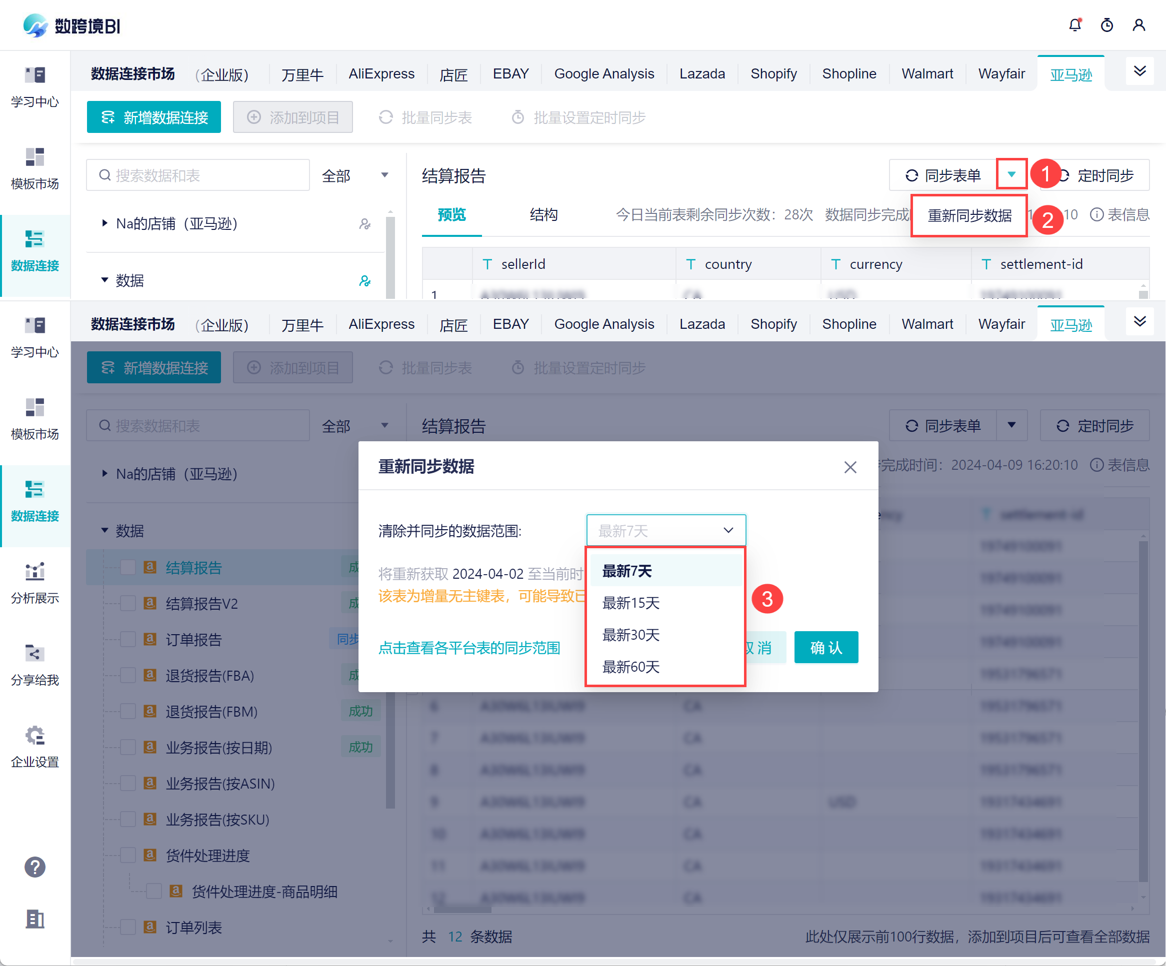在 电商数据源 中,可能会出现历史数据调整的情况,但手动同步不能将错误的历史数据覆盖。此时可以使用「重新同步数据」功能,将当前的数据清除并重新同步一个新的时间范围内的数据,如下图所示: