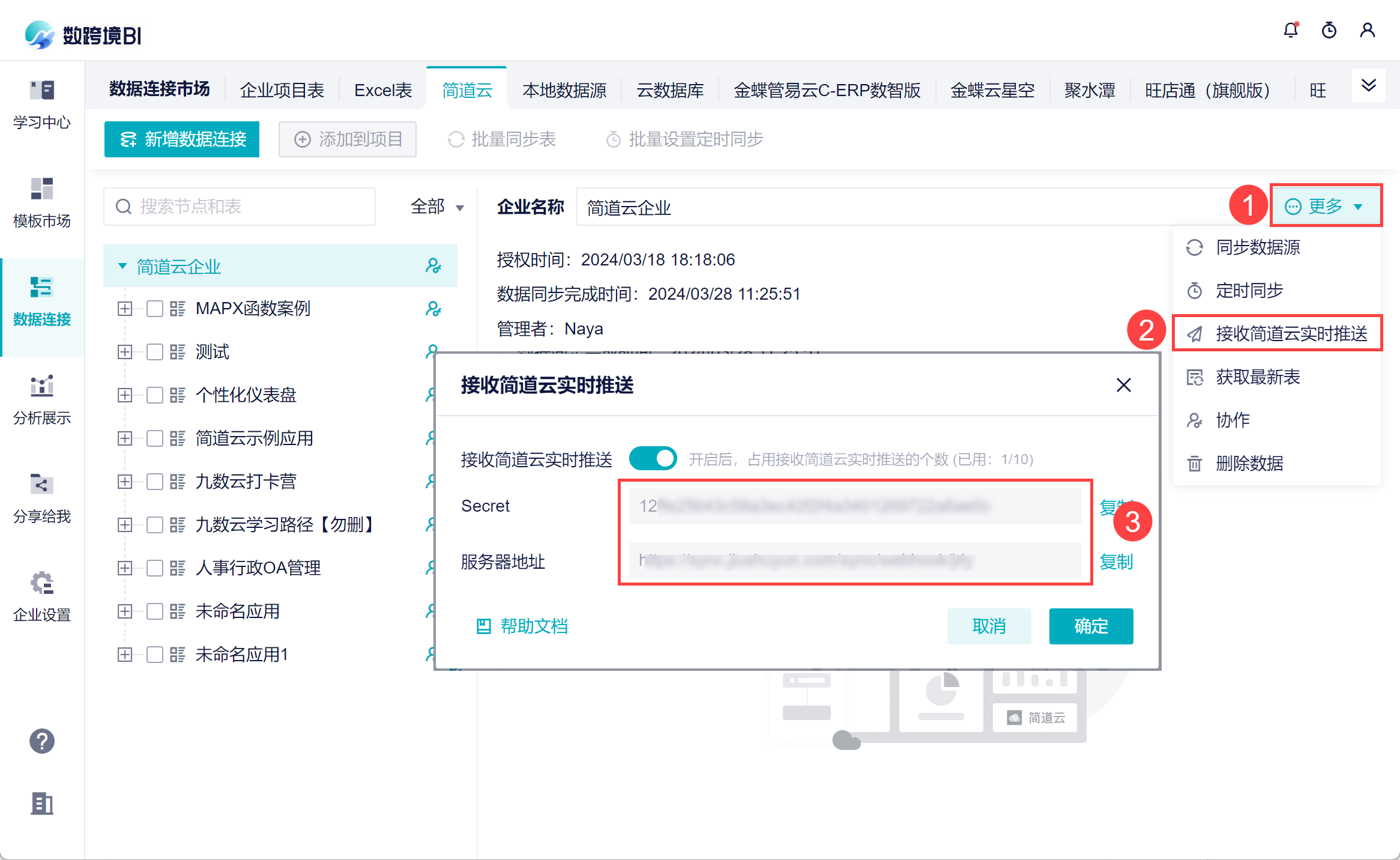 2)这里的实时推送数量是指同一个企业下,所有授权的简道云数据源数量。