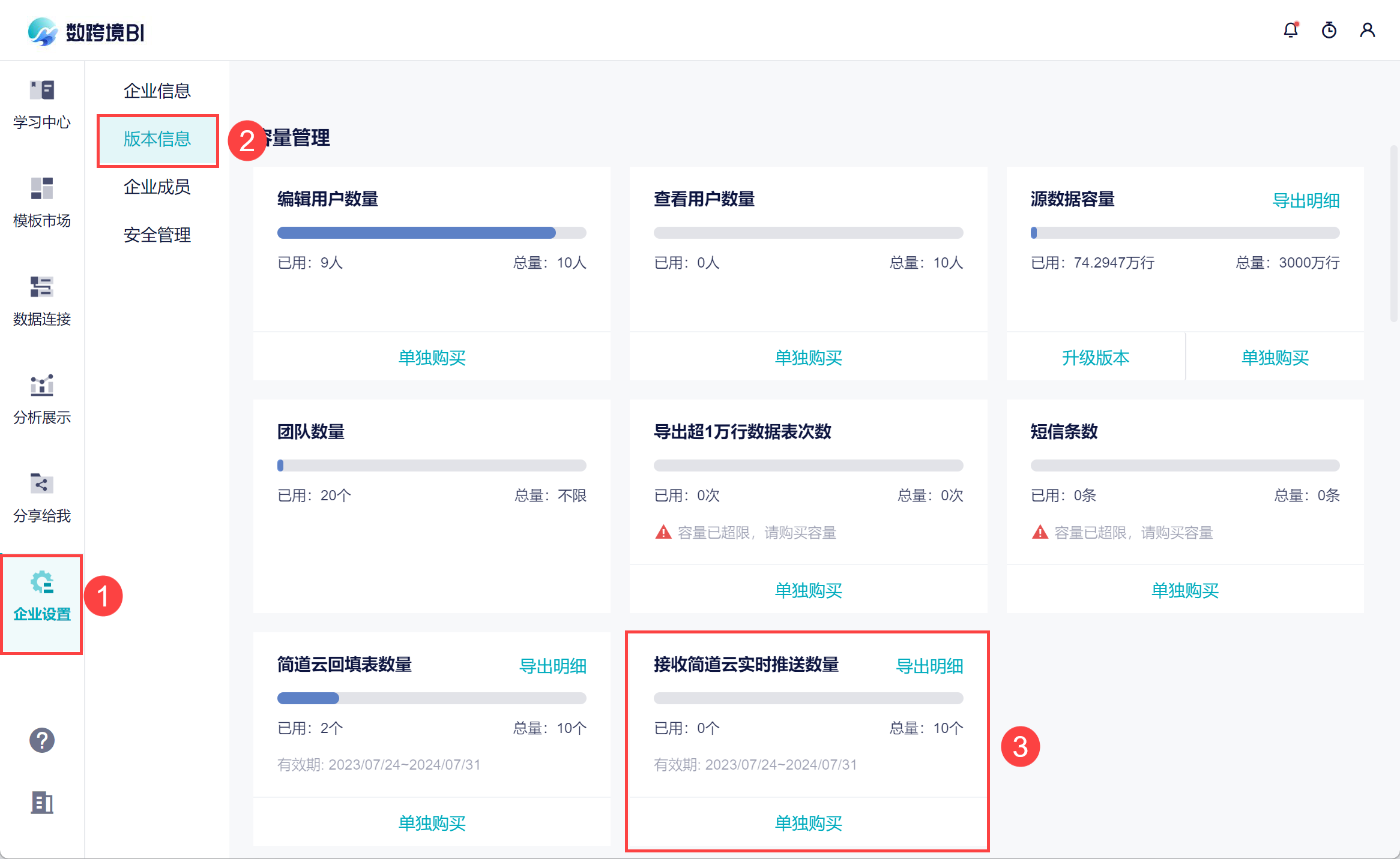请管理员购买实时推送数量(这里的数量是以简道云数据源为单位),购买 1 个容量,即有一个简道云数据源可设置「接受简道云实时推送」。