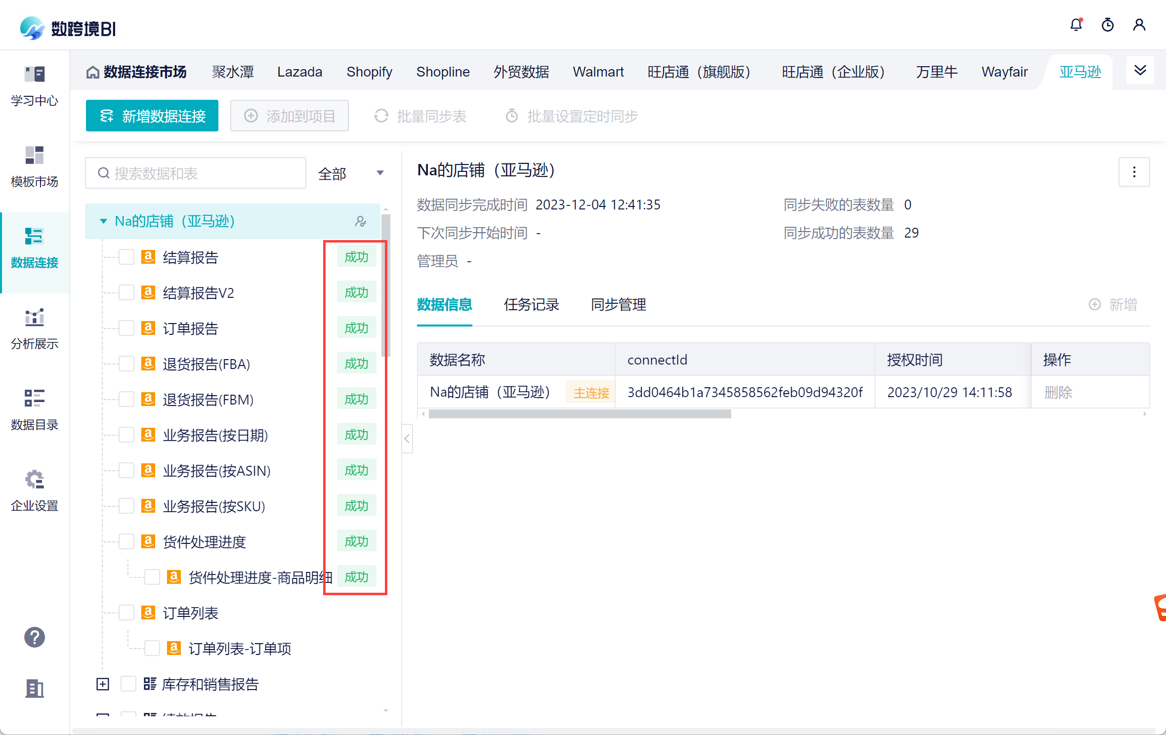 若数据源中有多个表数据都发生了变化,想要同步新的数据至数跨境,可以使用批量同步表/批量设置定时同步,就可以一次性同步多表。