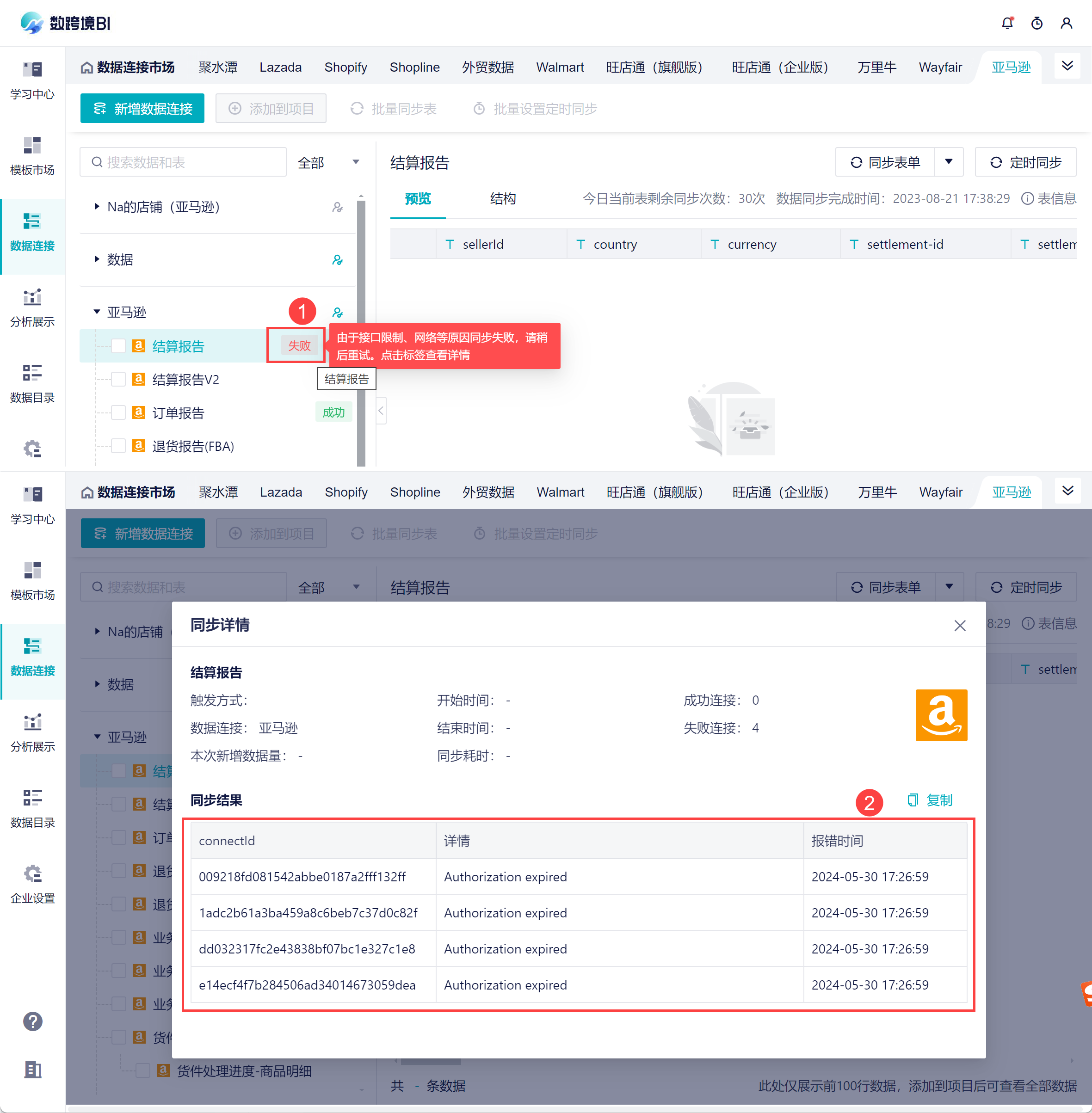 在电商数据源中,可能会出现历史数据调整的情况,但手动同步不能将错误的历史数据覆盖。 | 使用「重新同步数据」功能,将当前的数据清除并重新同步一个新的时间范围内的数据。 |