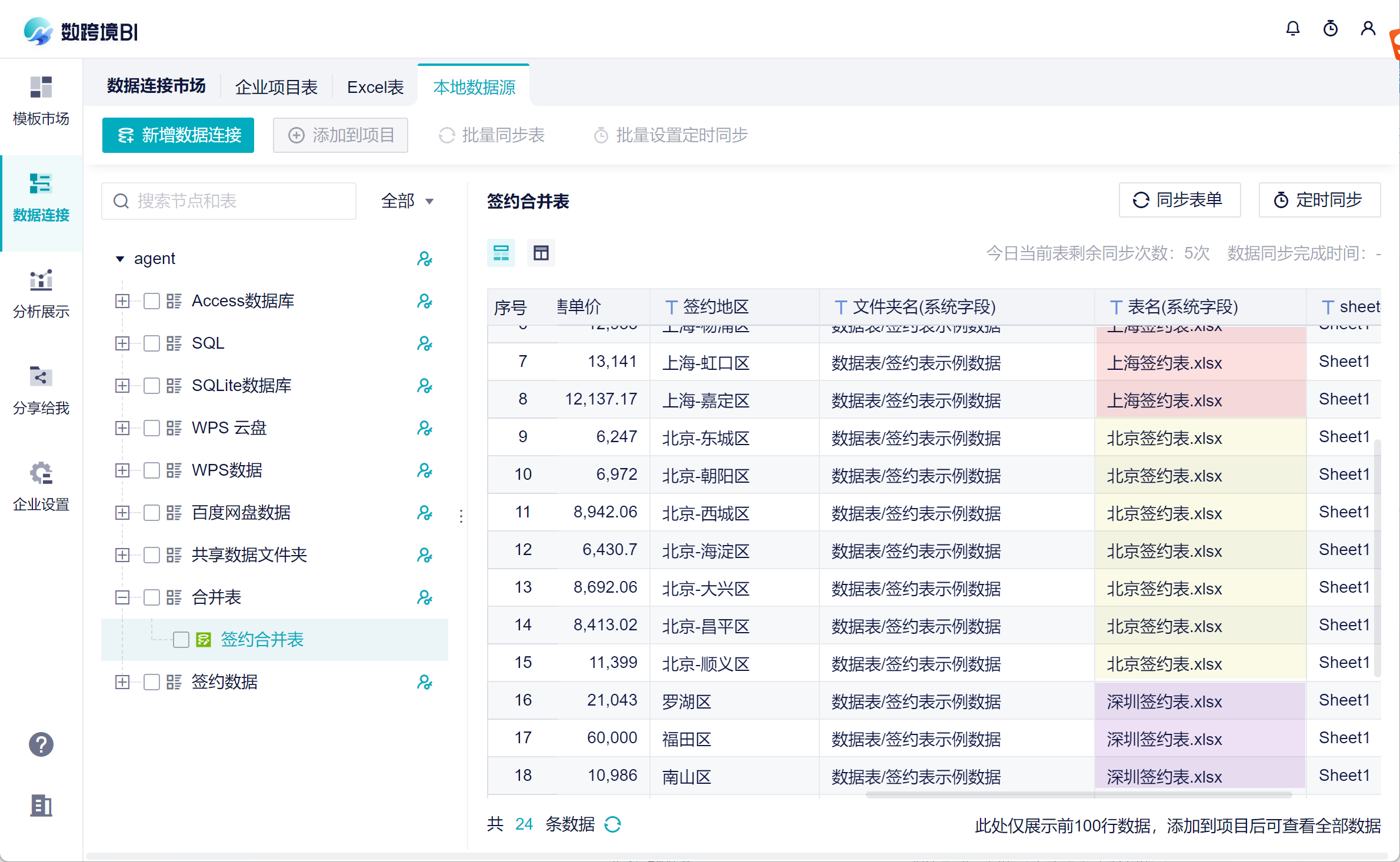 6)在数跨境中也会同步这张合并表,将所有签约表合并为一张表。且后续在「签约表示例数据」中再增加其他城市表,那么数跨境中也会自动合并。如下图所示: