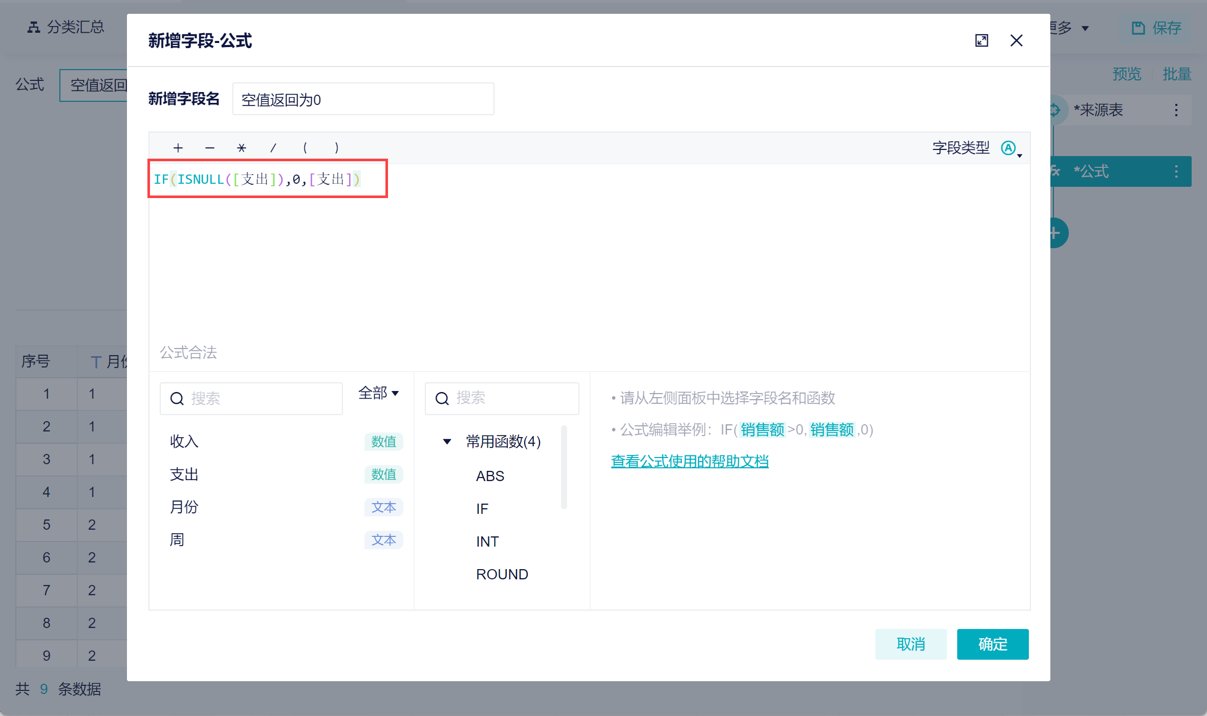 | IF(ISNULL([支出]),0,[支出]) | 判断「支出」字段值是否为空值,若为空值,返回 0,否则返回原字段值 |