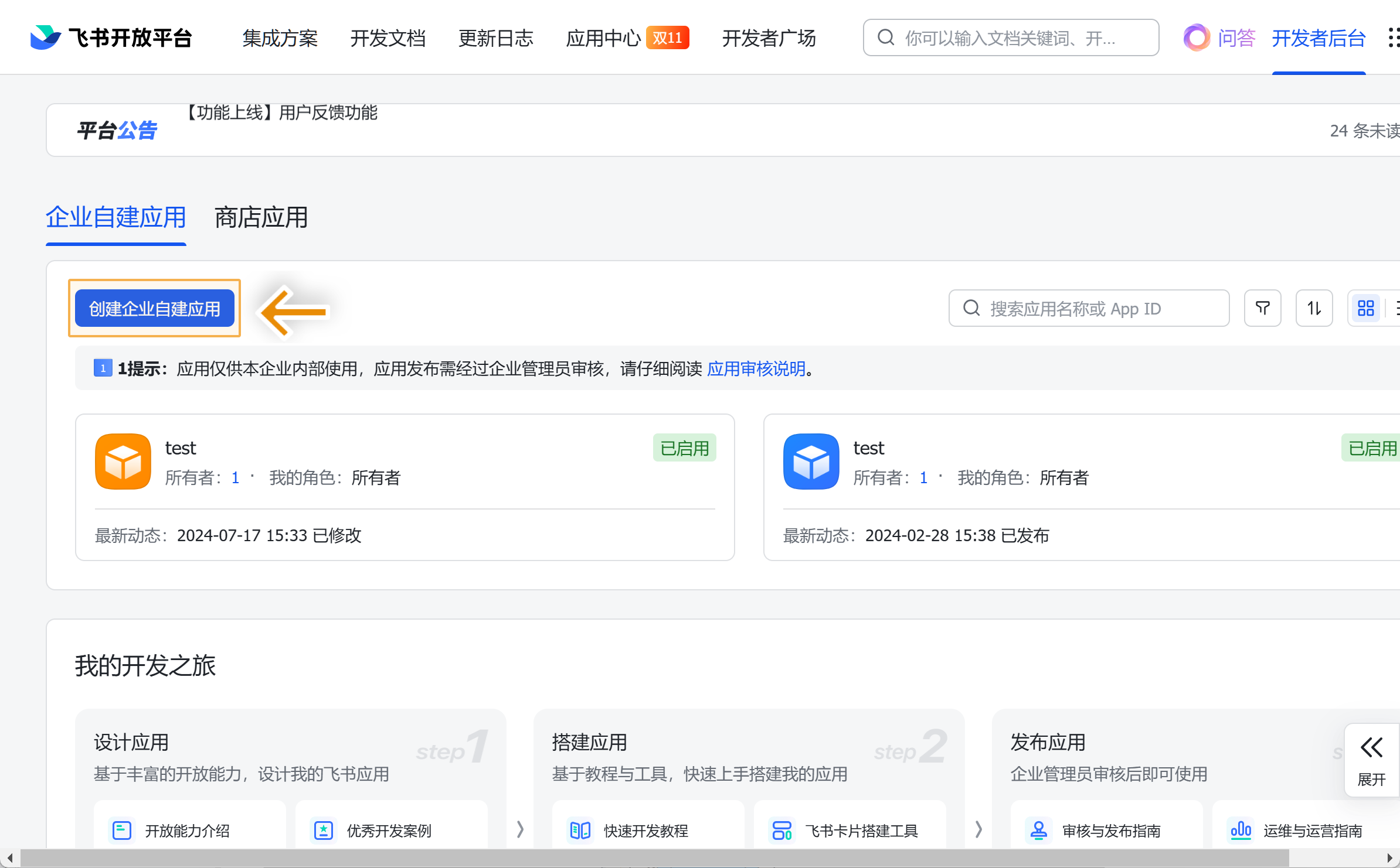 1)请飞书企业超级管理员进入 飞书开放平台 创建一个内部应用。如下图所示: