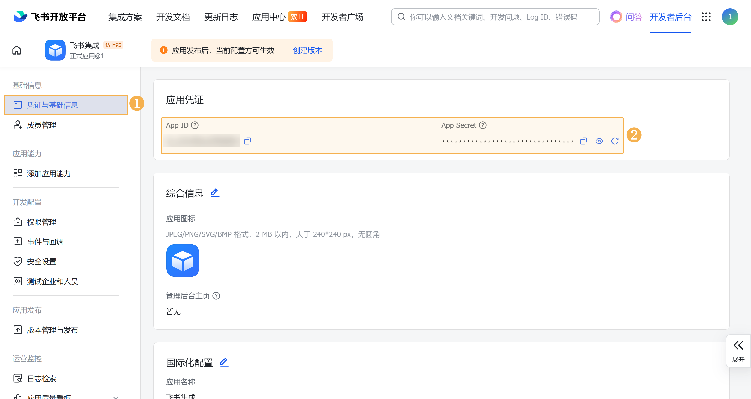 3)在「凭证与基础信息」中,将 AppID 和 App Secret 信息记录下来。