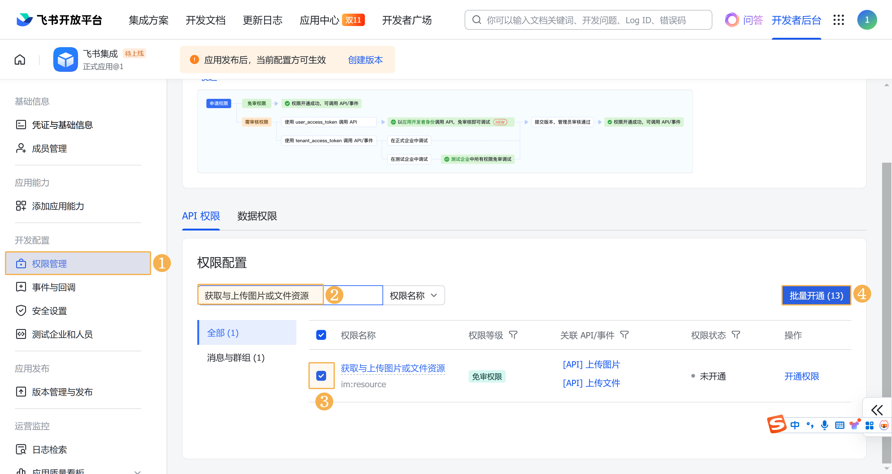 在「权限管理」中,搜索并勾选上述的所有权限,然后点击「批量开通」。如下图所示: