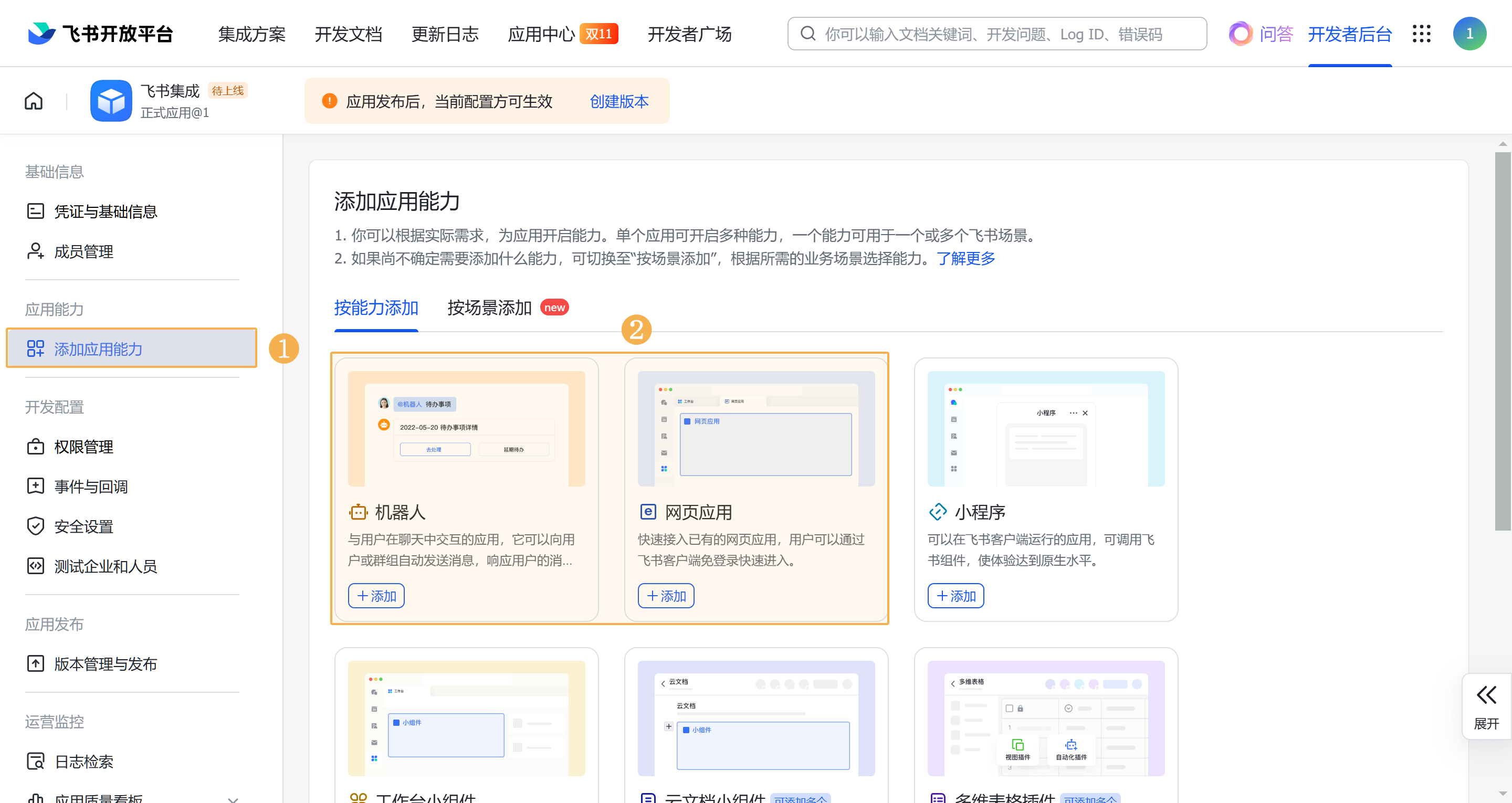 1)在「添加应用能力」中,添加「机器人」、「网页应用」能力。如下图所示: