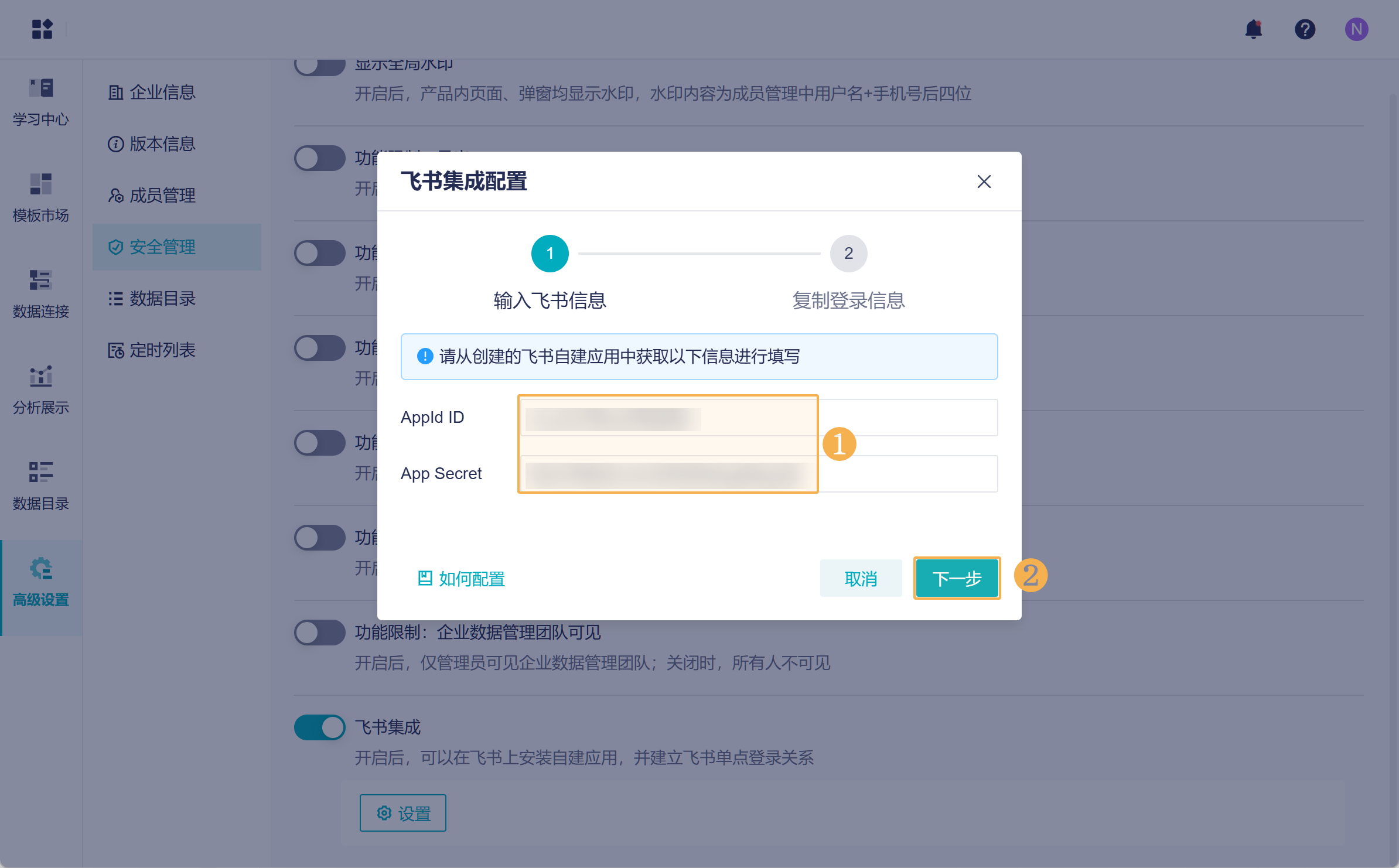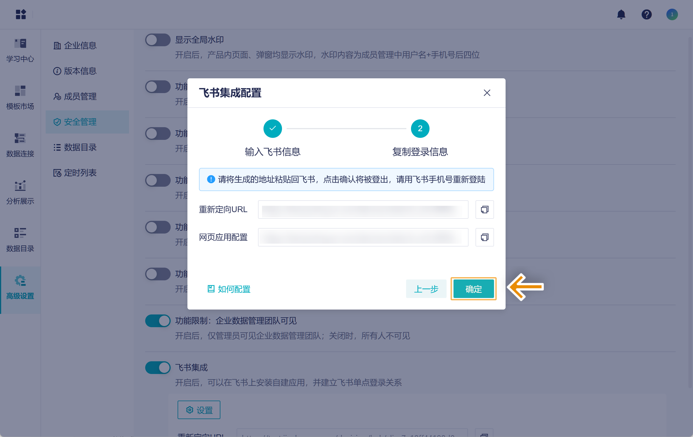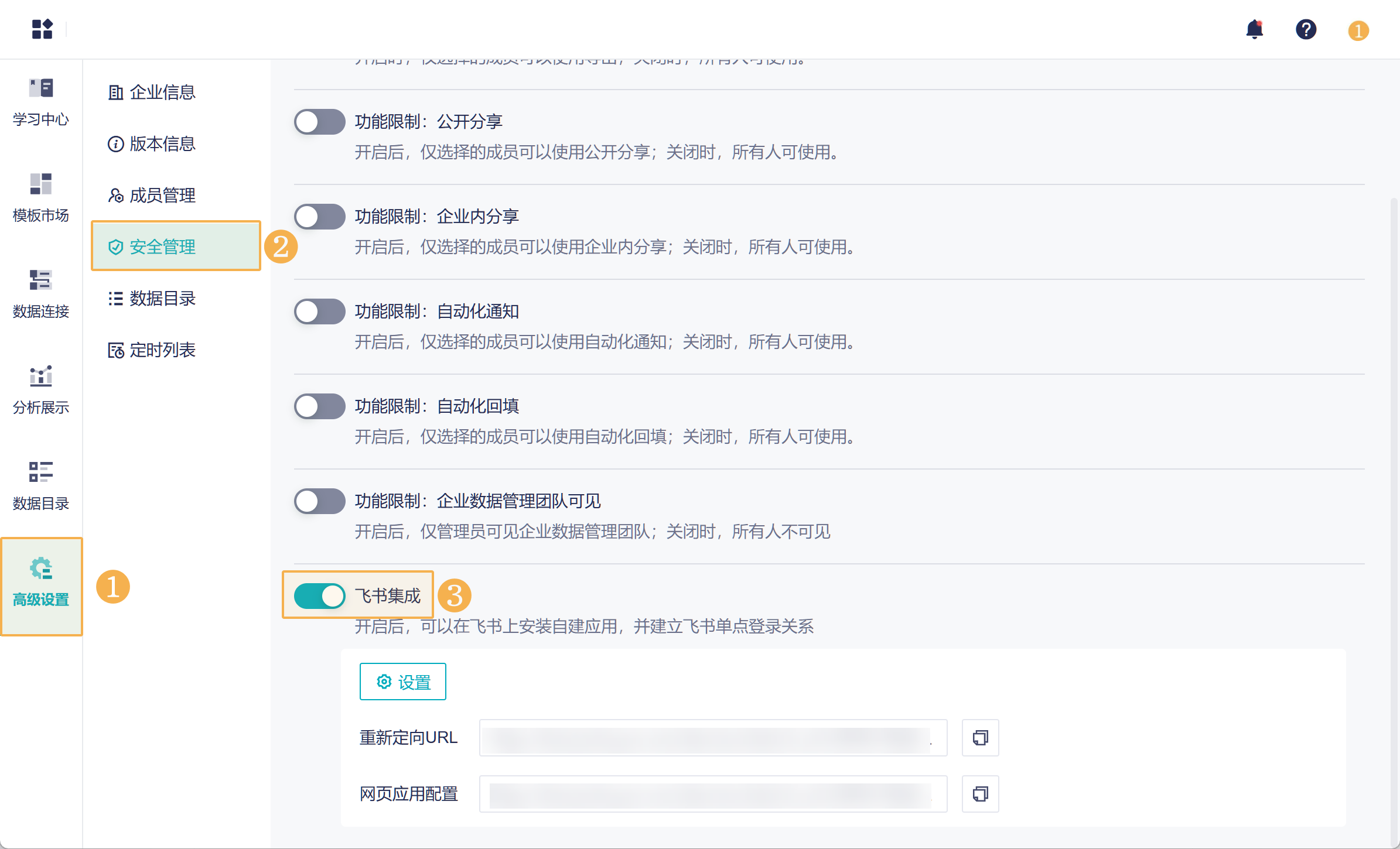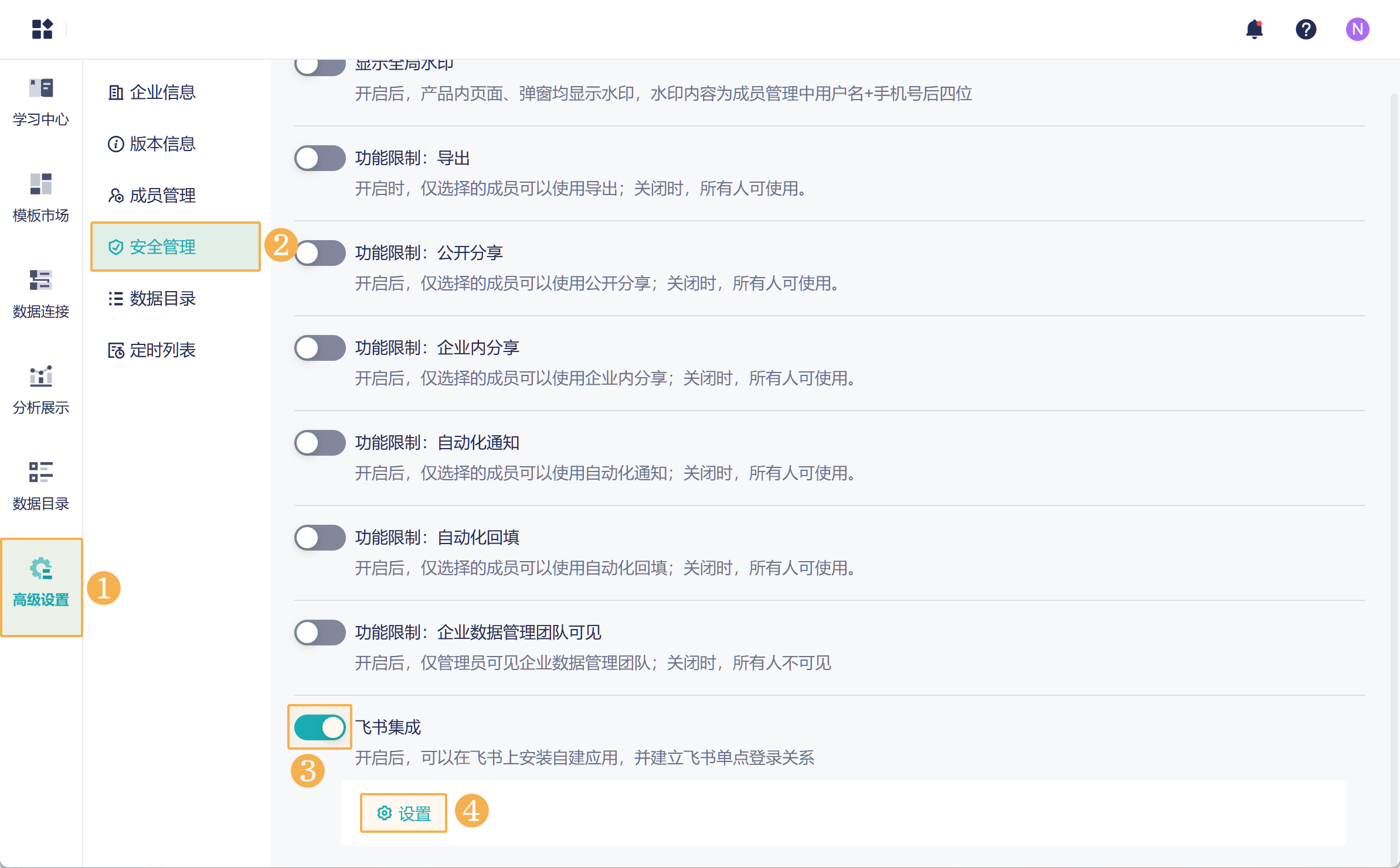 1)回到本产品中,请超管进入安全管理页面,开启「飞书集成」。如下图所示: