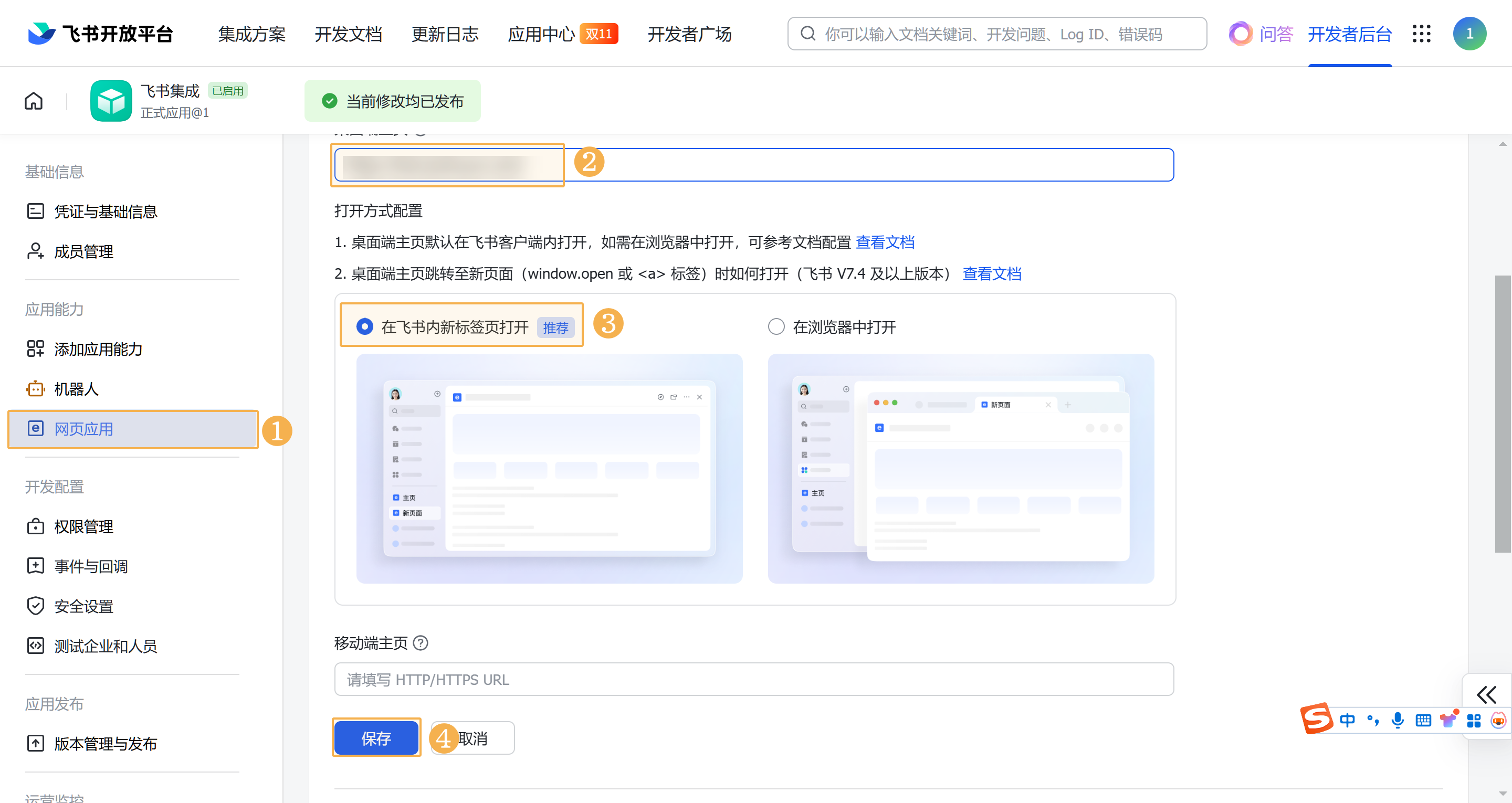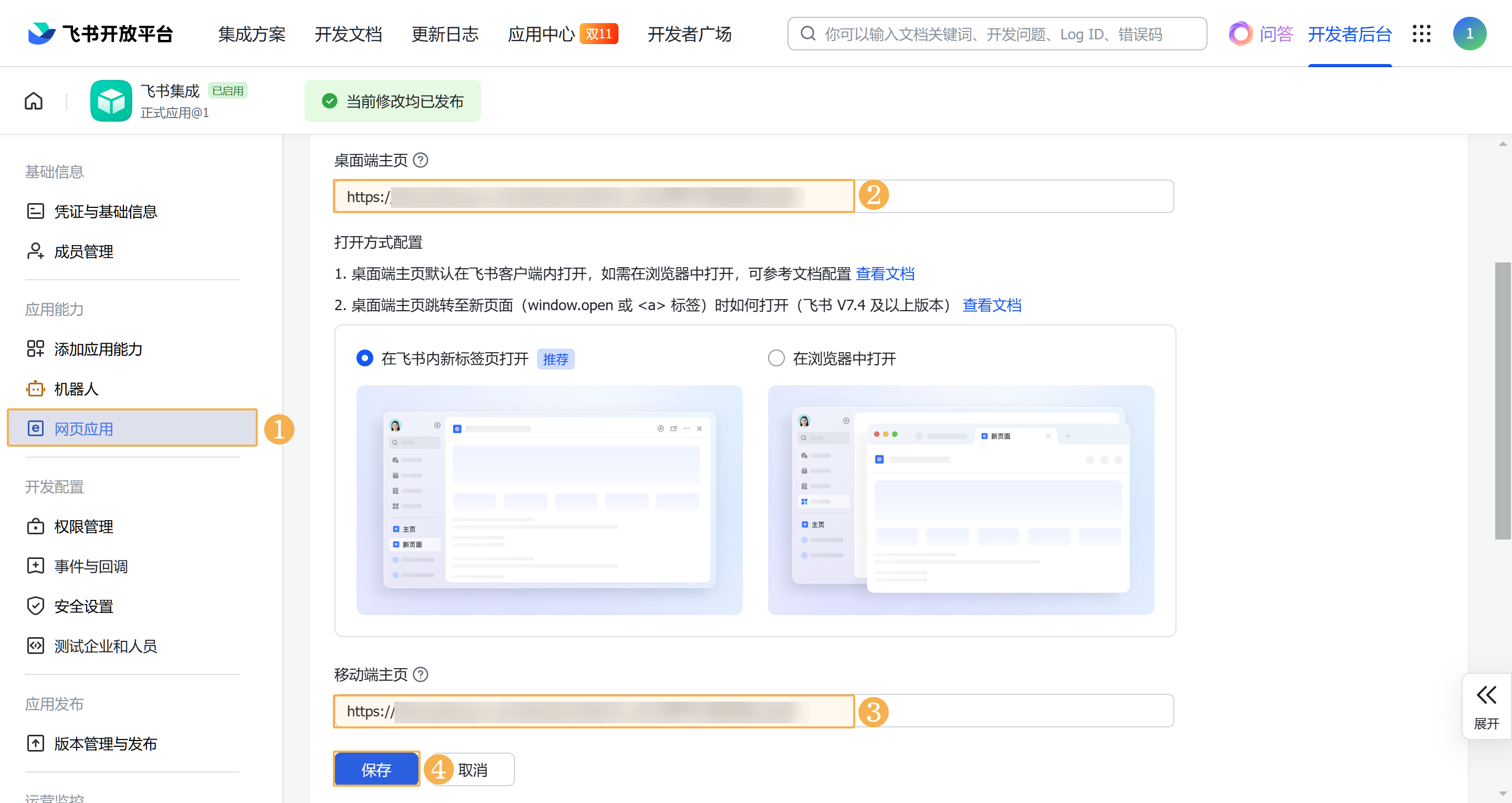 5)进入网页应用中,重新编辑配置,将弹窗中的「网页应用配置 URL 」填写在桌面端主页、移动端主页。如下图所示: