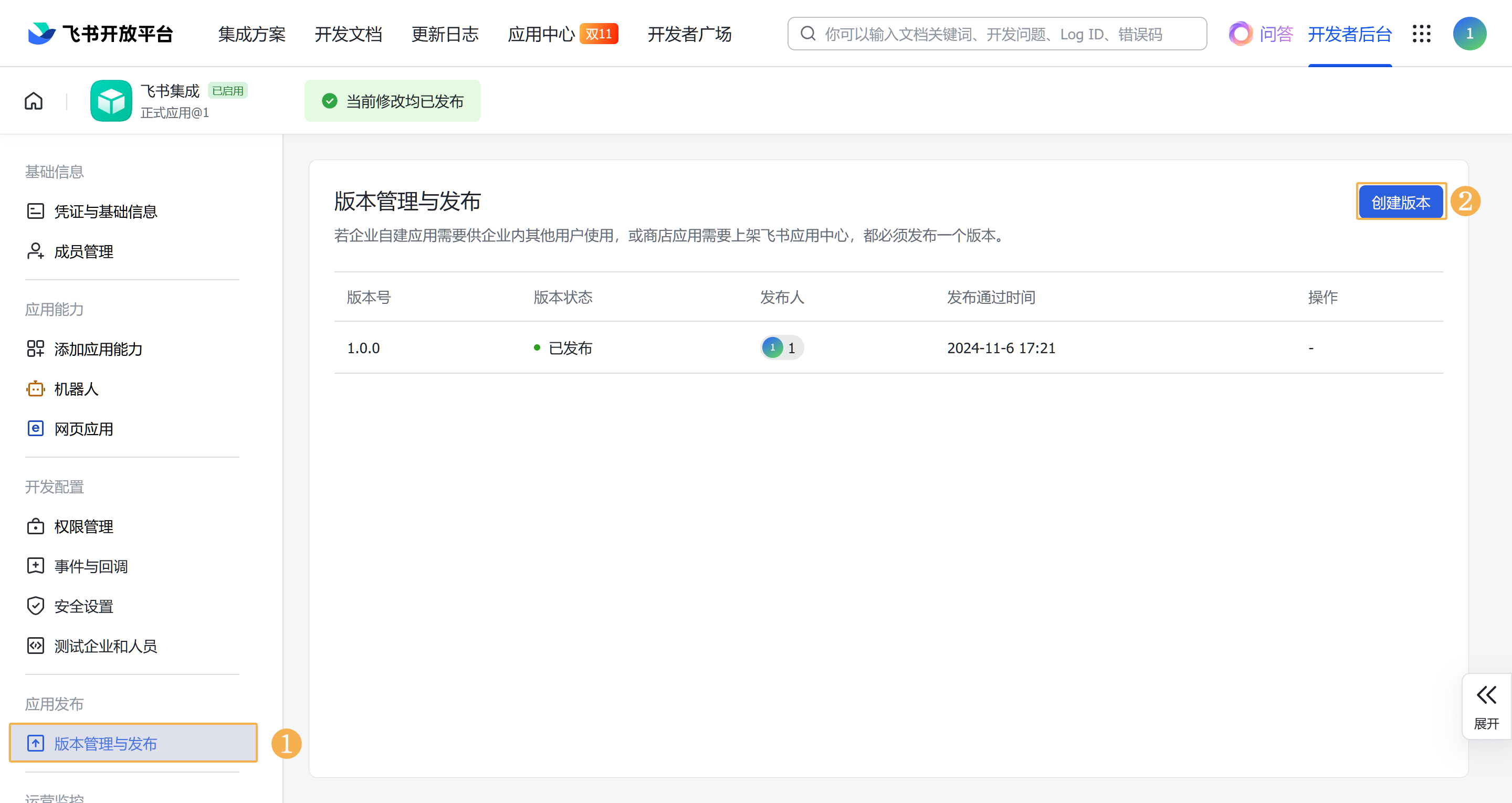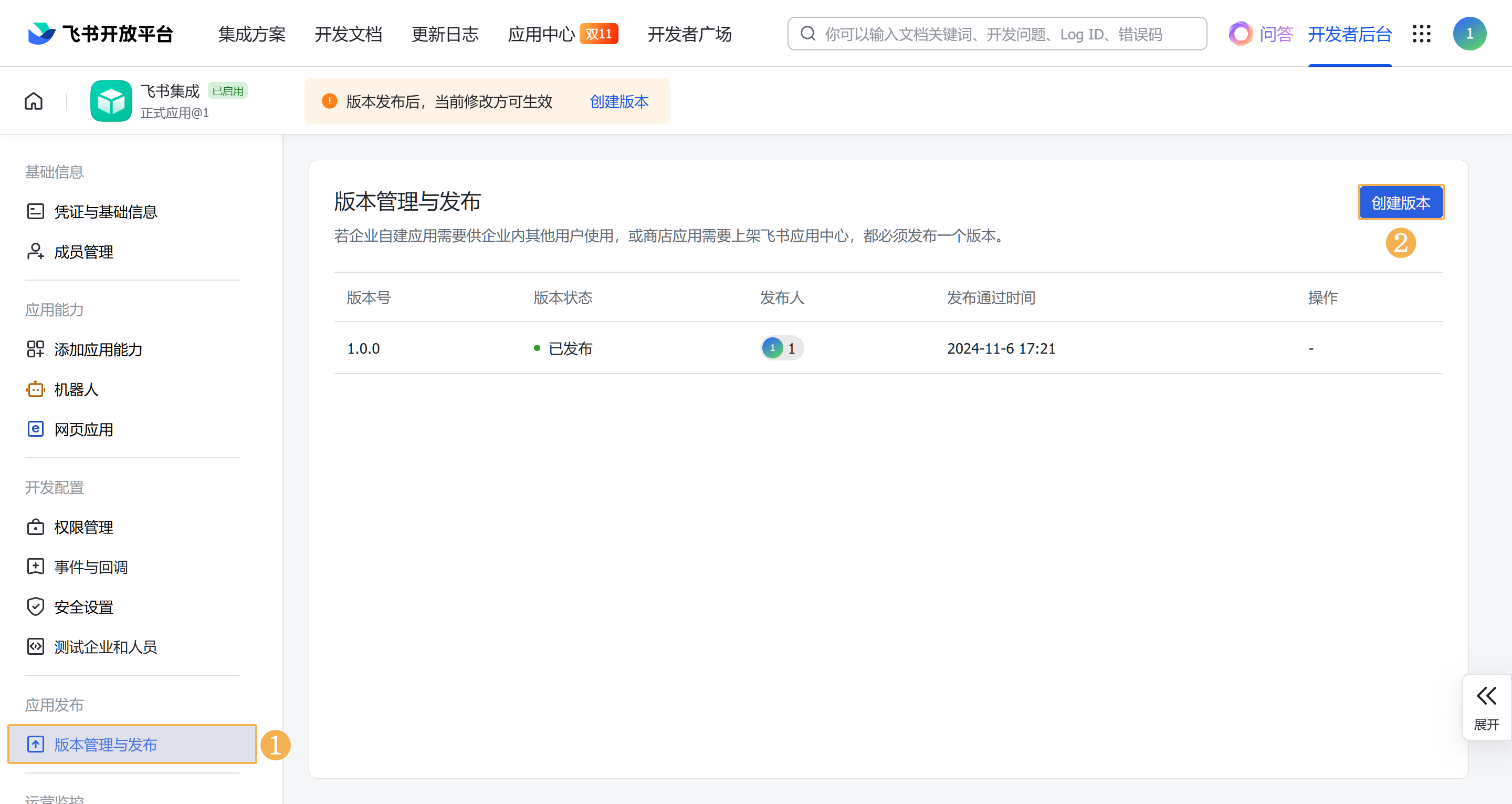 3)完成以上设置后,进入「版本管理与发布」, 点击右侧的创建版本,填写相关信息后发布版本,使配置生效。如下图所示: