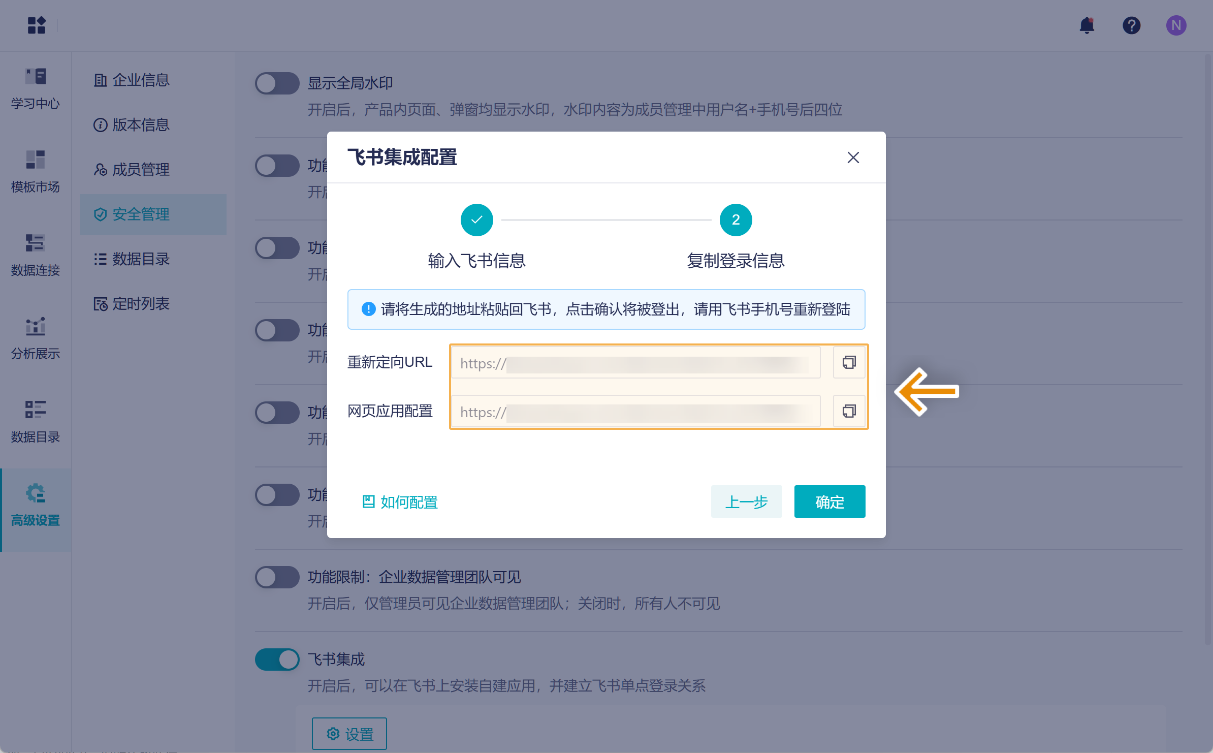 3)复制「重新定向 URL」、「网页应用配置」信息,填写在飞书中。如下图所示: