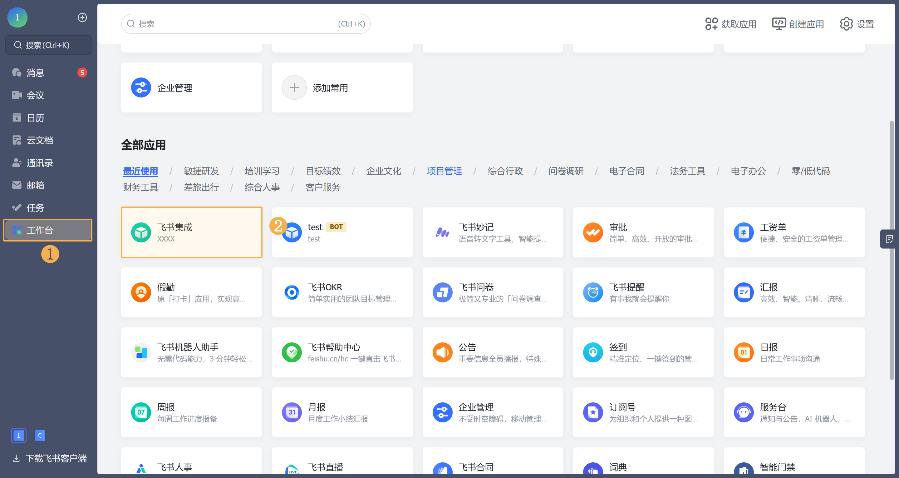 2)在飞书工作台中会展示自建应用,点击即可在工作台中使用本产品。如下图所示: