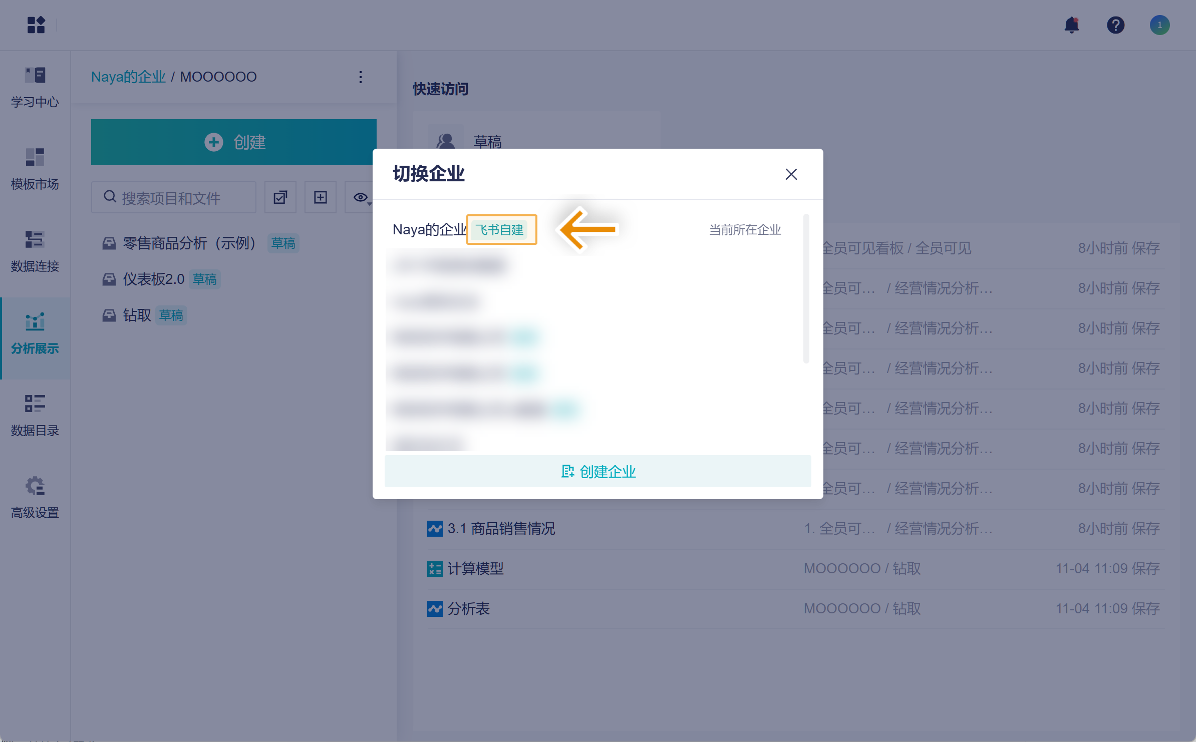 3)如果在浏览器中使用产品,可使用飞书手机号登录,且企业标签会切换成「飞书自建」标签。如下图所示: