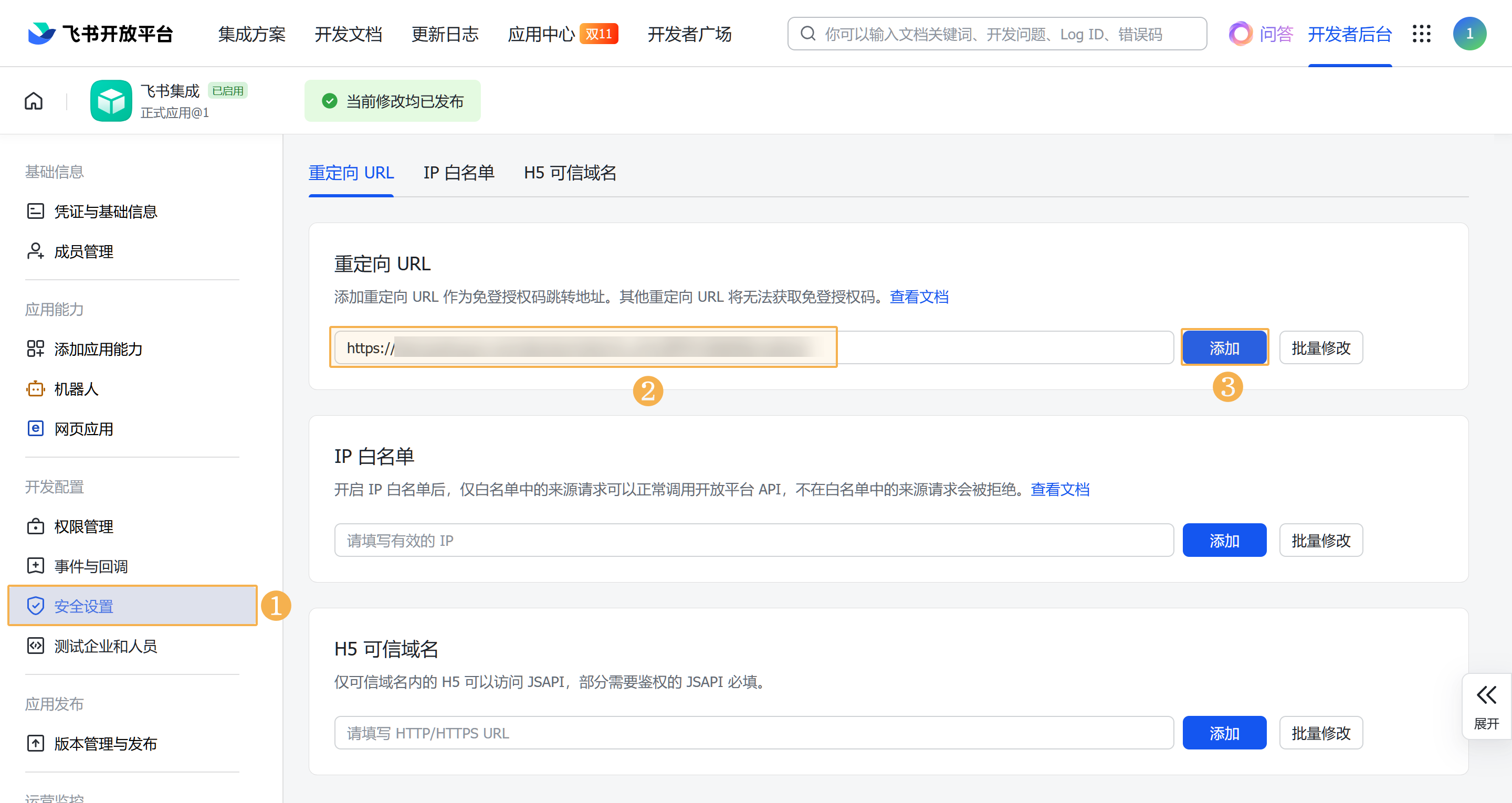 4)回到自建应用中,进入「安全设置」页,将重定向 URL 填写在此处。如下图所示: