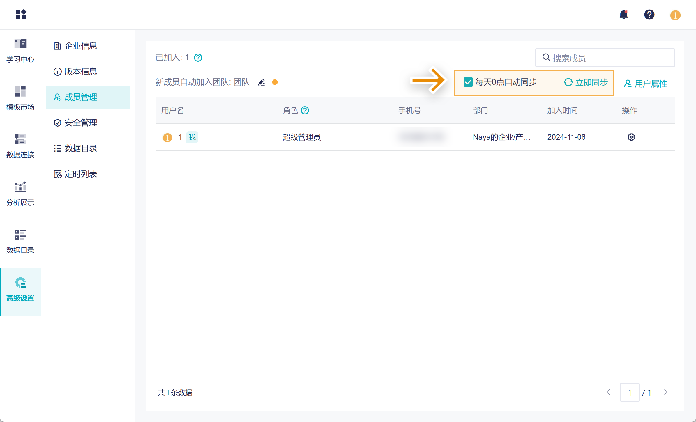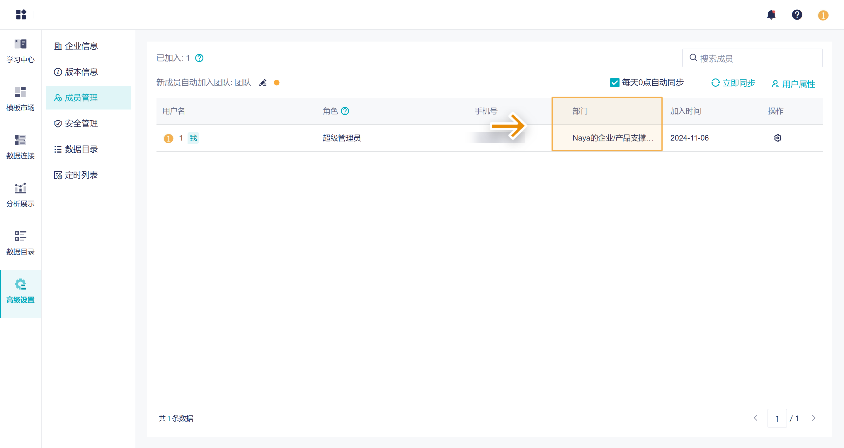 1)设置完成后,进入本产品,在「成员管理」中可以获取「通讯录权限范围」的成员,并获取部门信息。如下图所示: