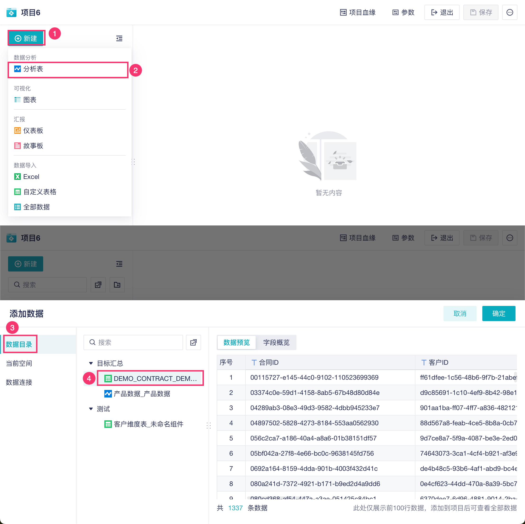 以 Excel 表为例,在项目中选择创建一张分析表,如下图所示: