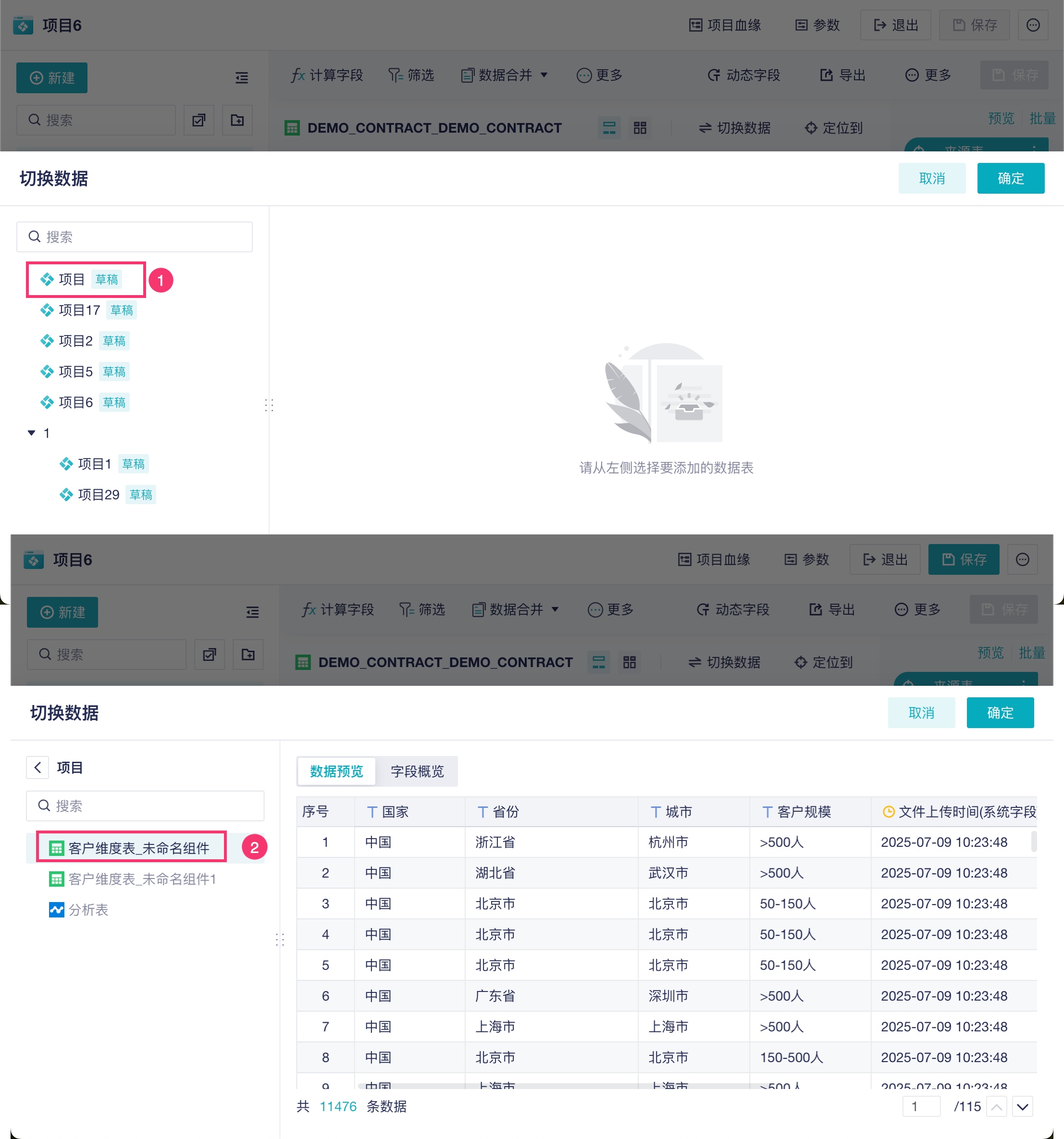 点击后进入分析表制作页面,在「来源表」步骤中点击「切换」,就可以对更换来源表数据。如下图所示: