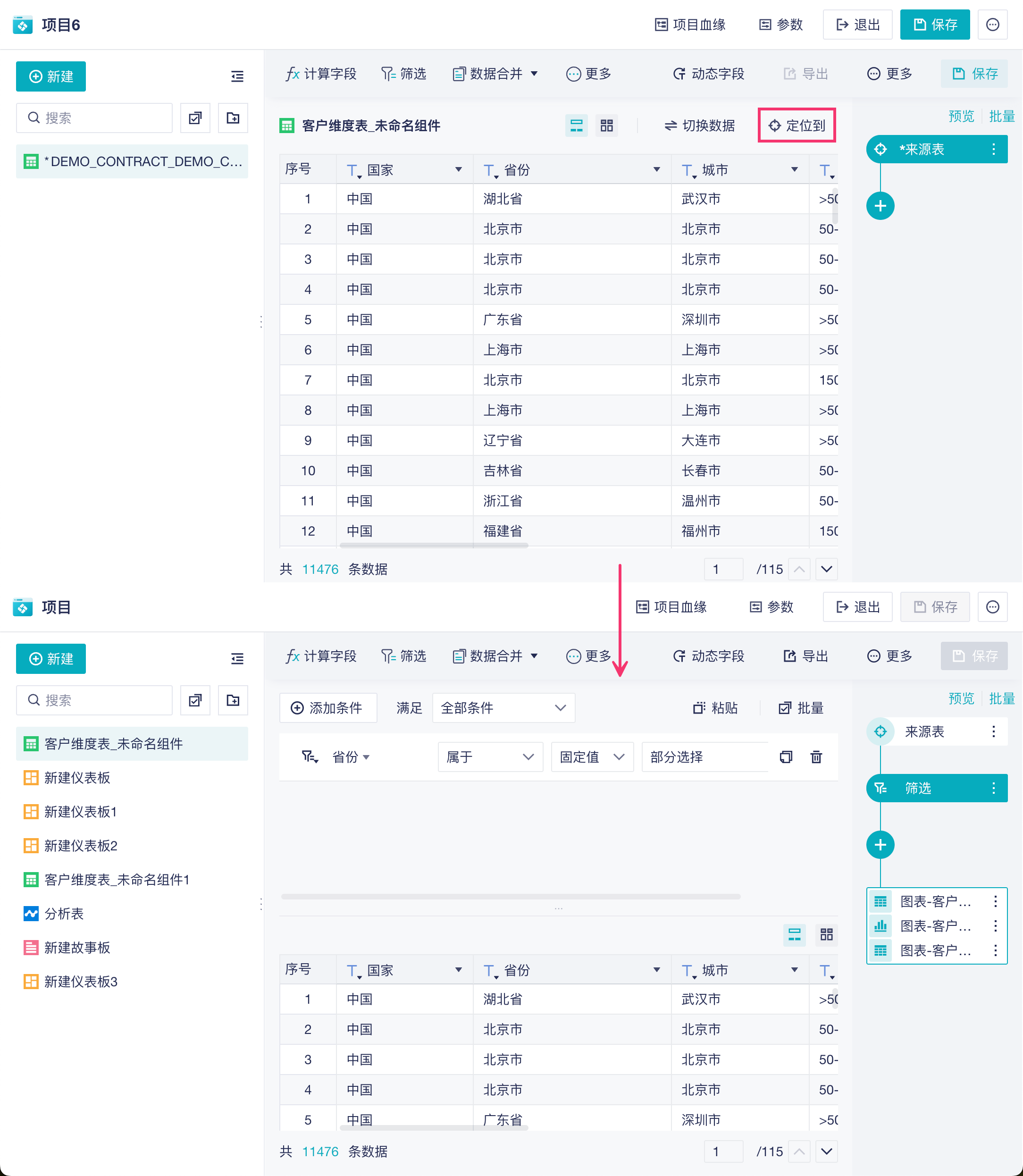 可以选择项目中的数据表,即将这张表的结果数据作为来源表数据。如下图所示: