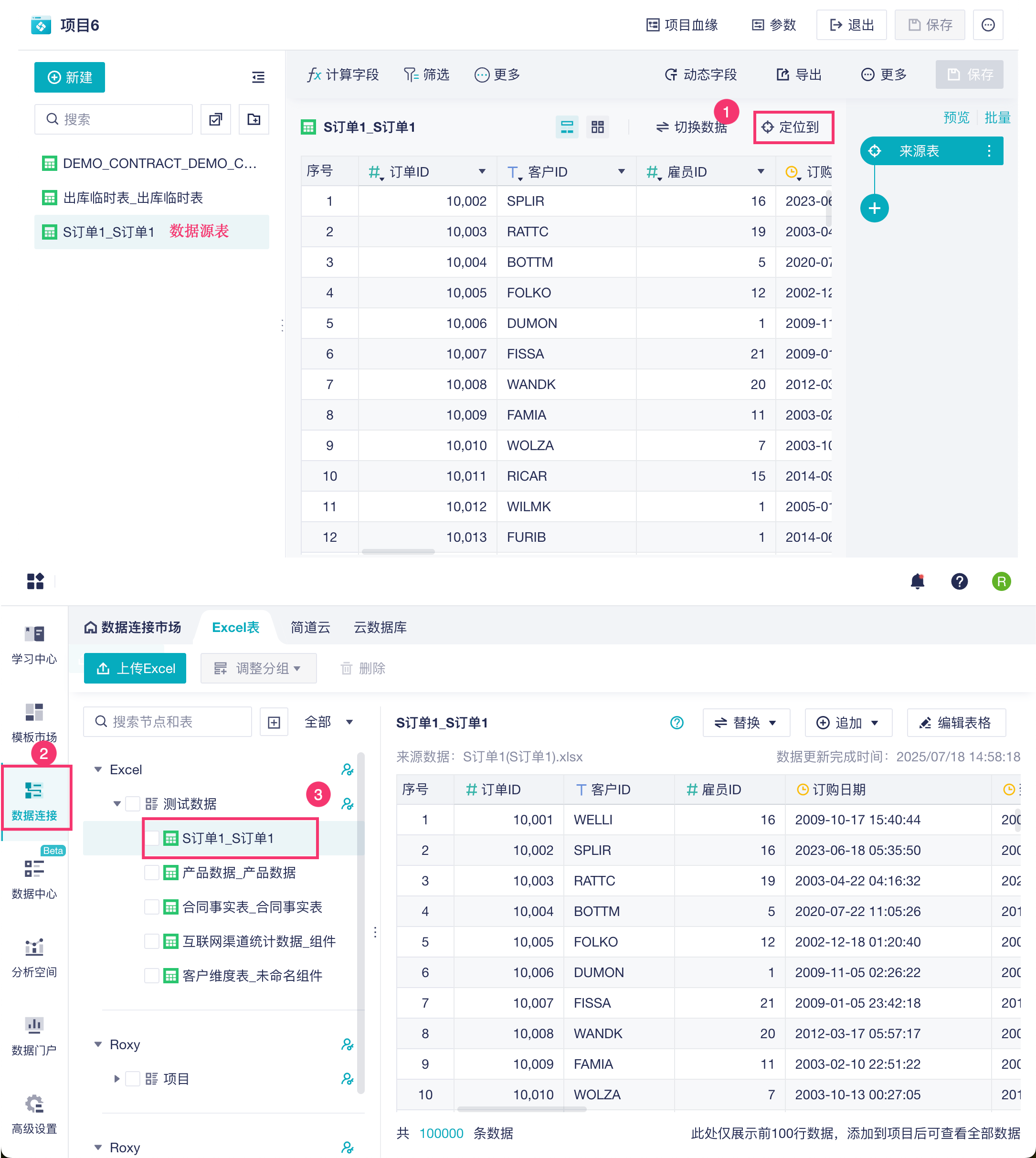 2)如果当前表是数据源表,即从「数据连接」处添加的表。点击「定位到」按钮就会进入到数据源管理界面,可以再进行一些操作。