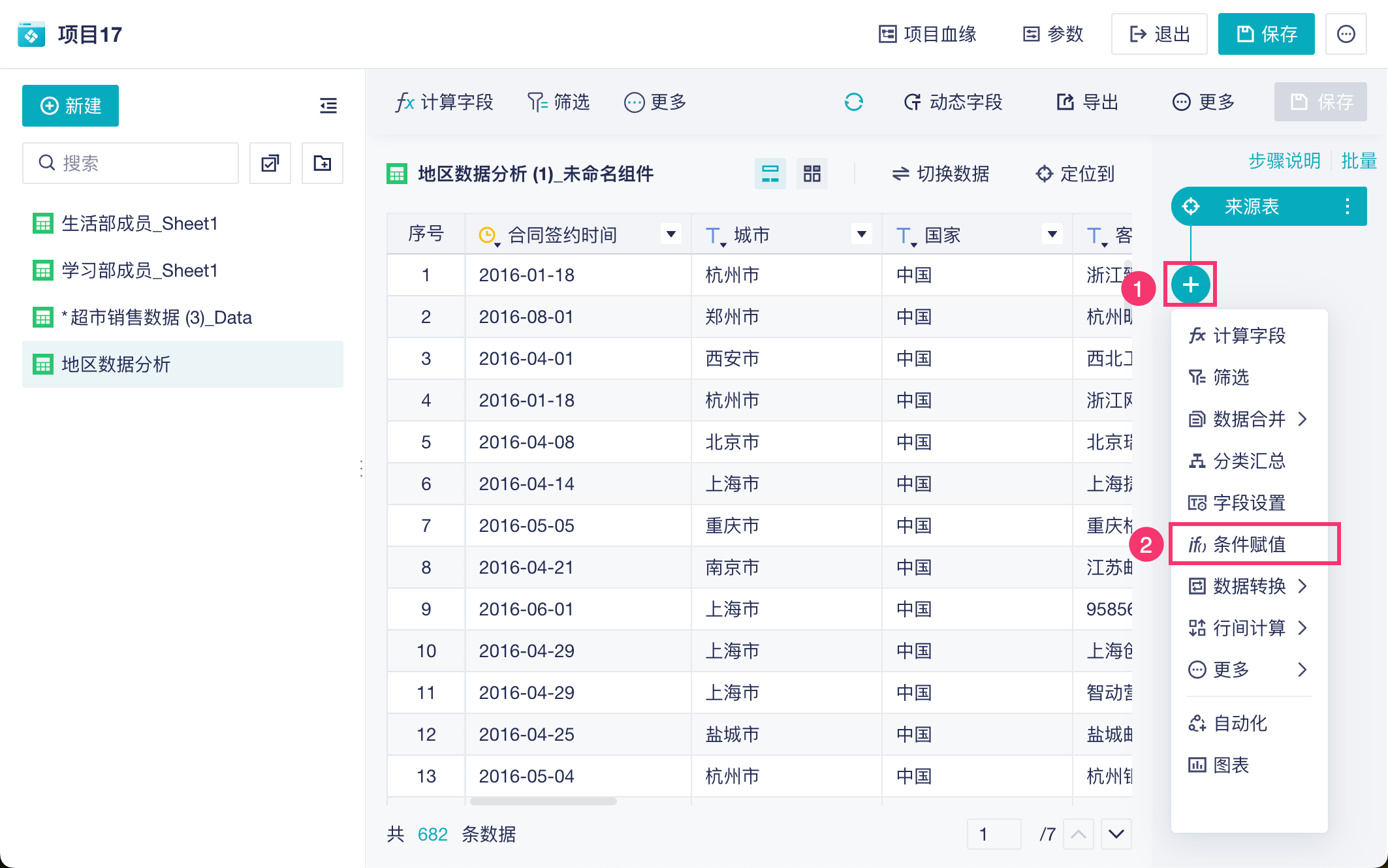 条件赋值可替代 IF/IFS 函数,实现复杂条件,在可视化窗口中,通过简单的参数设置,即可实现多条件分组赋值的效果: