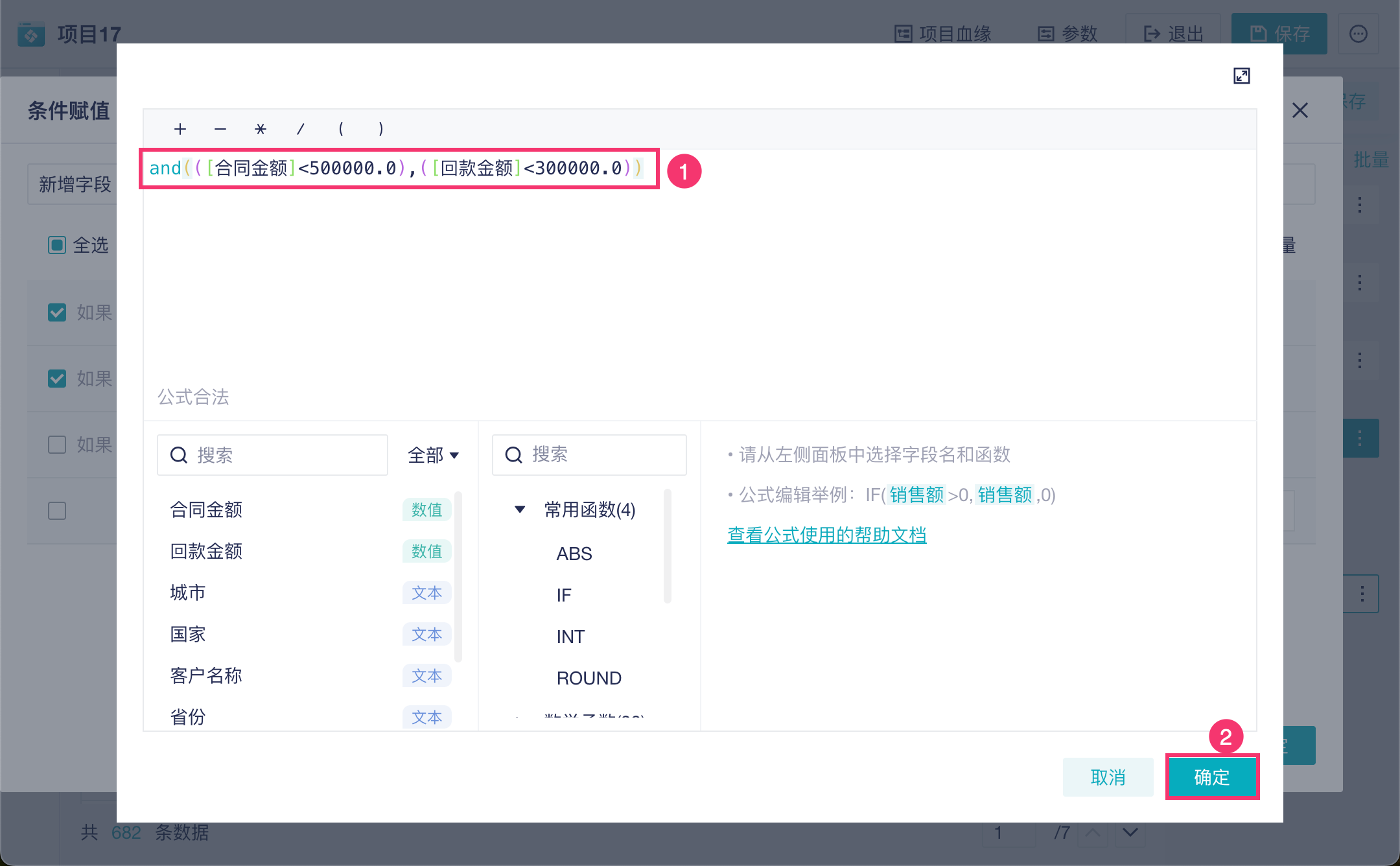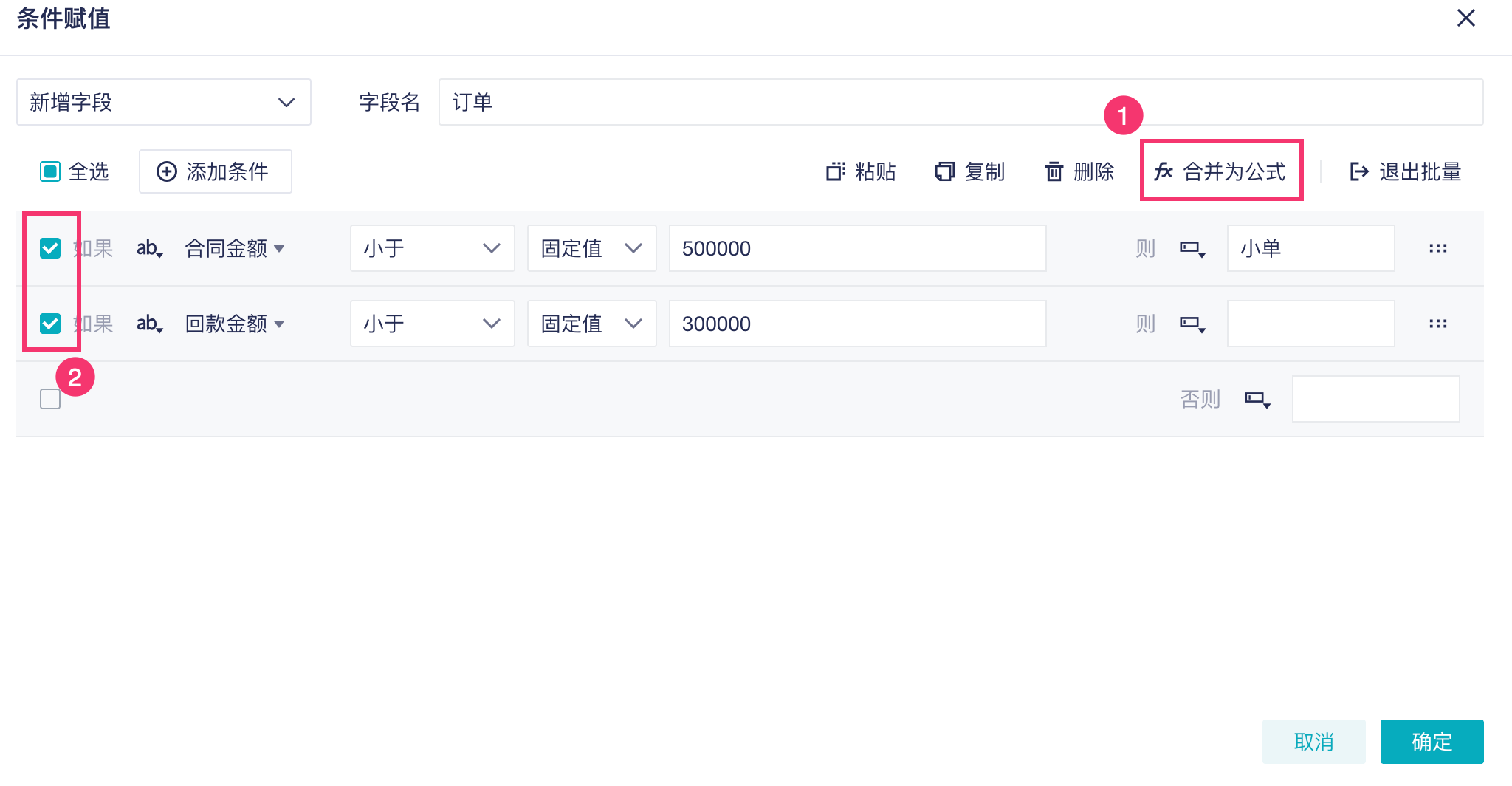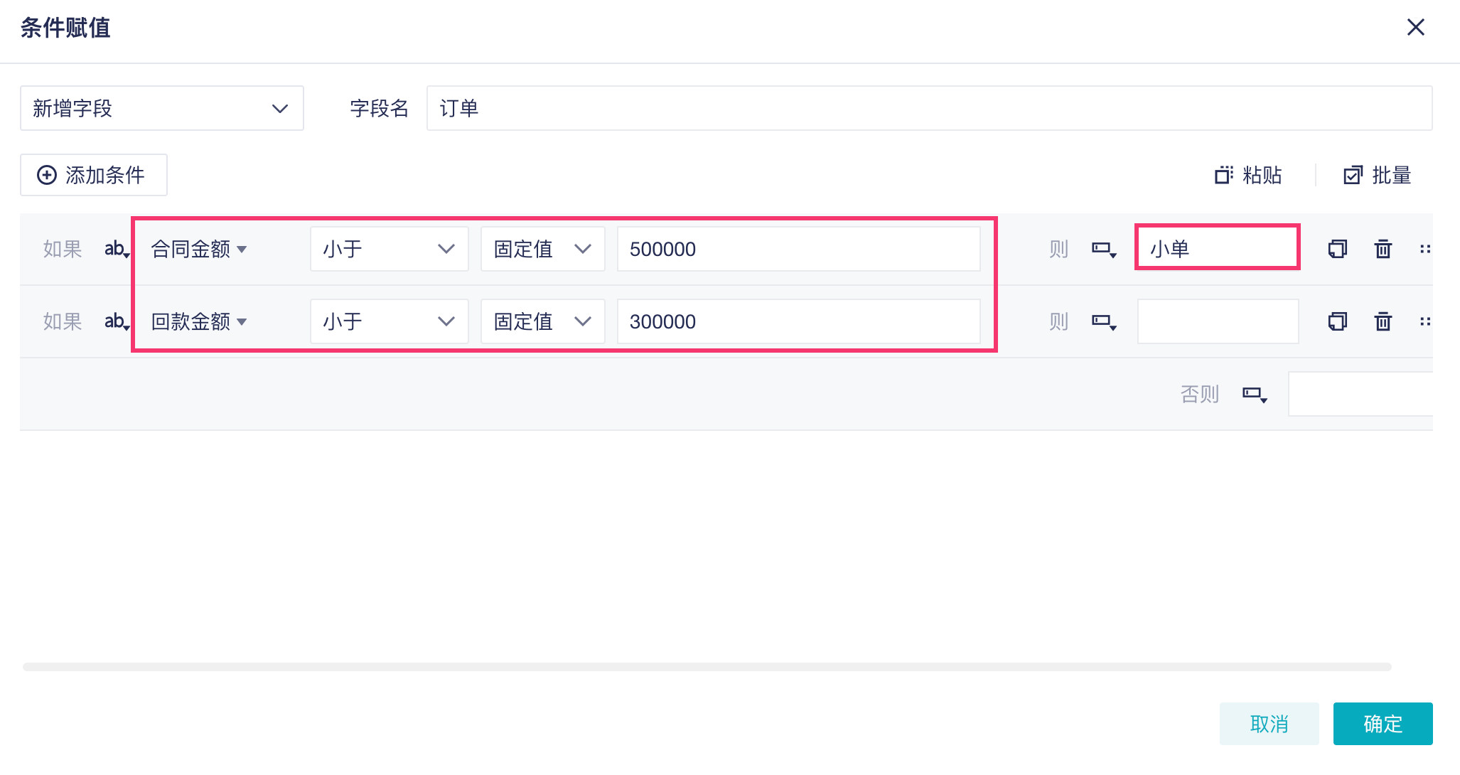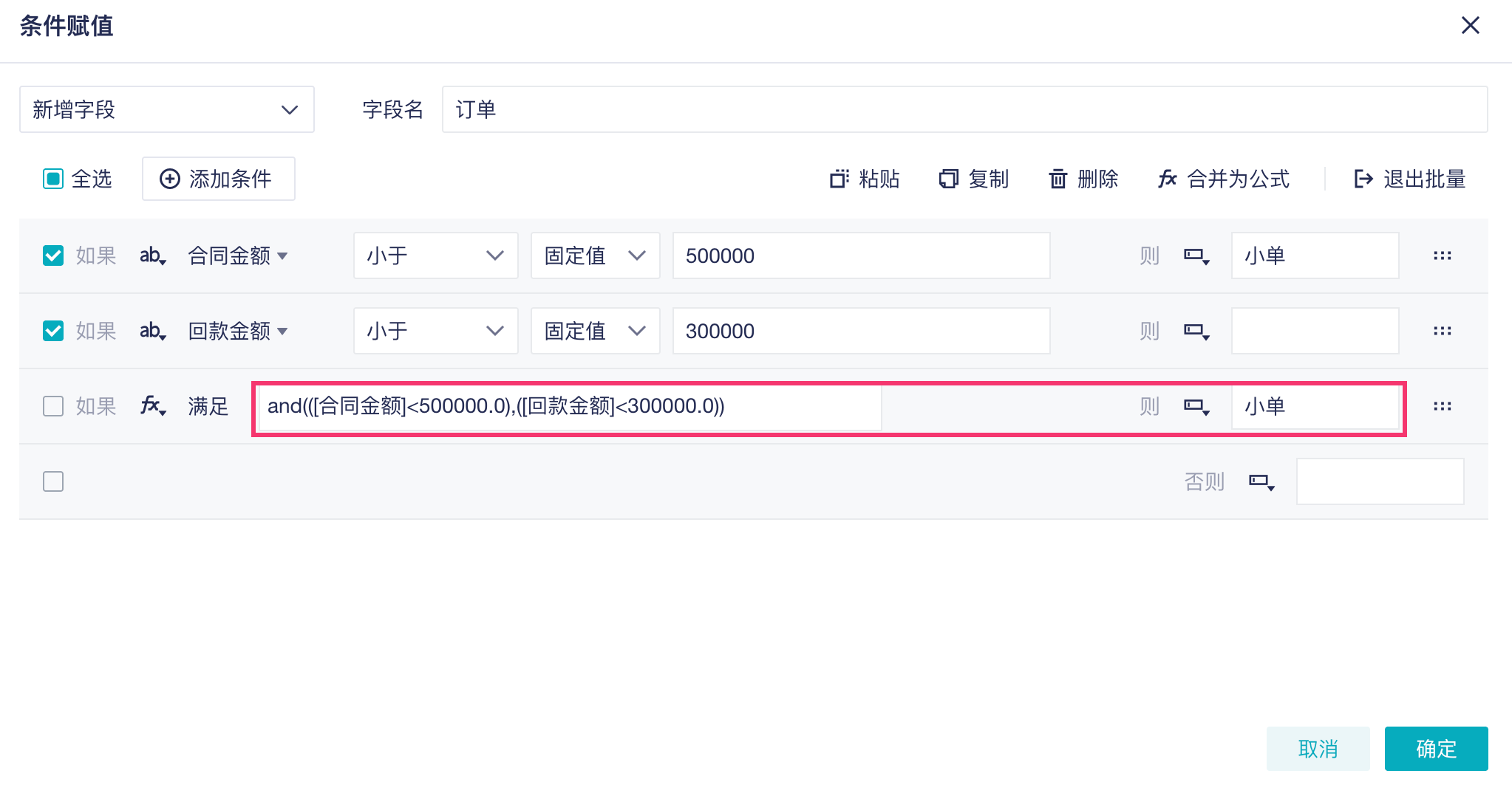 1)用户在设置条件时,需要结合多个条件判断一个赋值,例如需要将「合同金额<500000,且回款金额<300000」判断为小单。如下图所示: