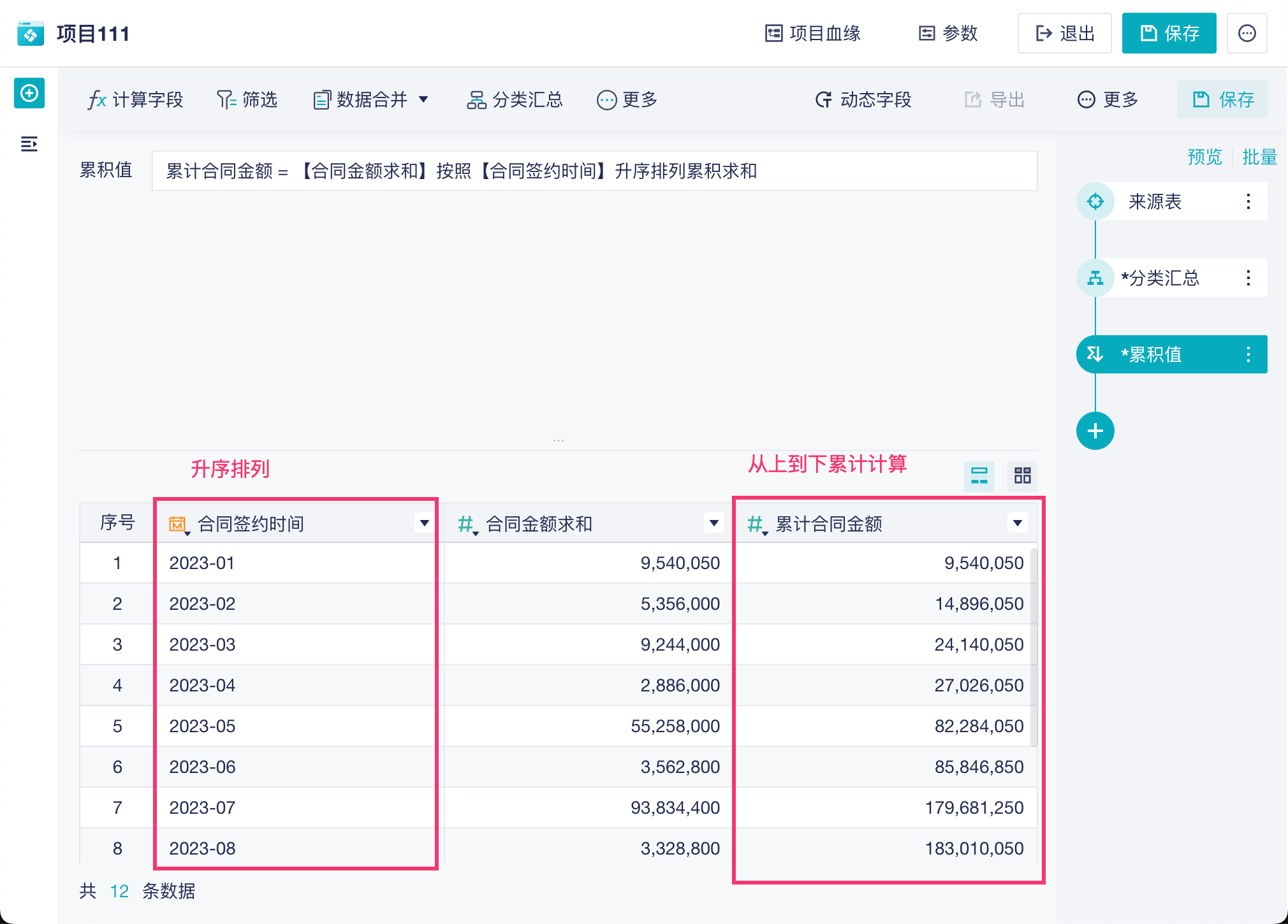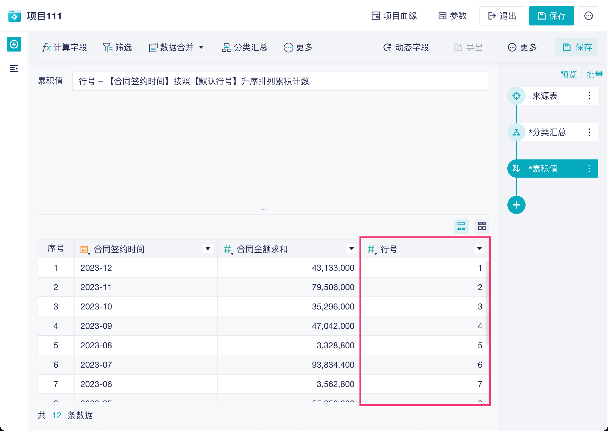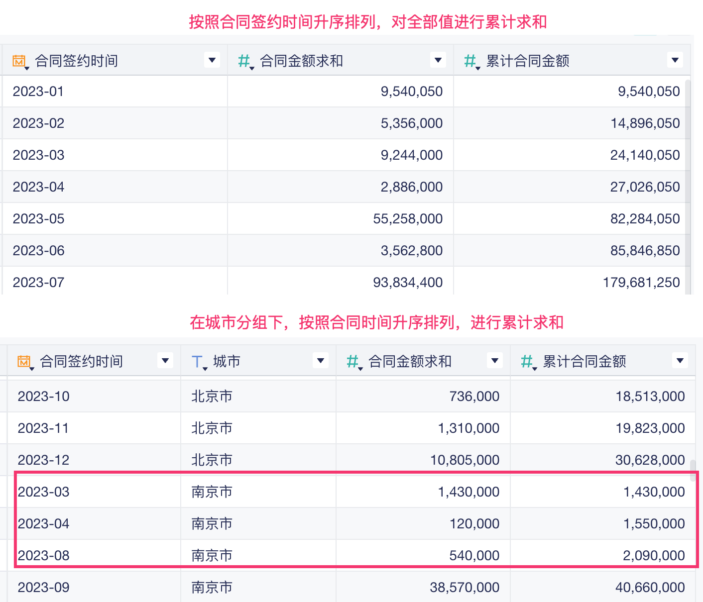 输出结果会将「合同签约时间」进行升序排列,再计算「合同金额」累积值。如下图所示: