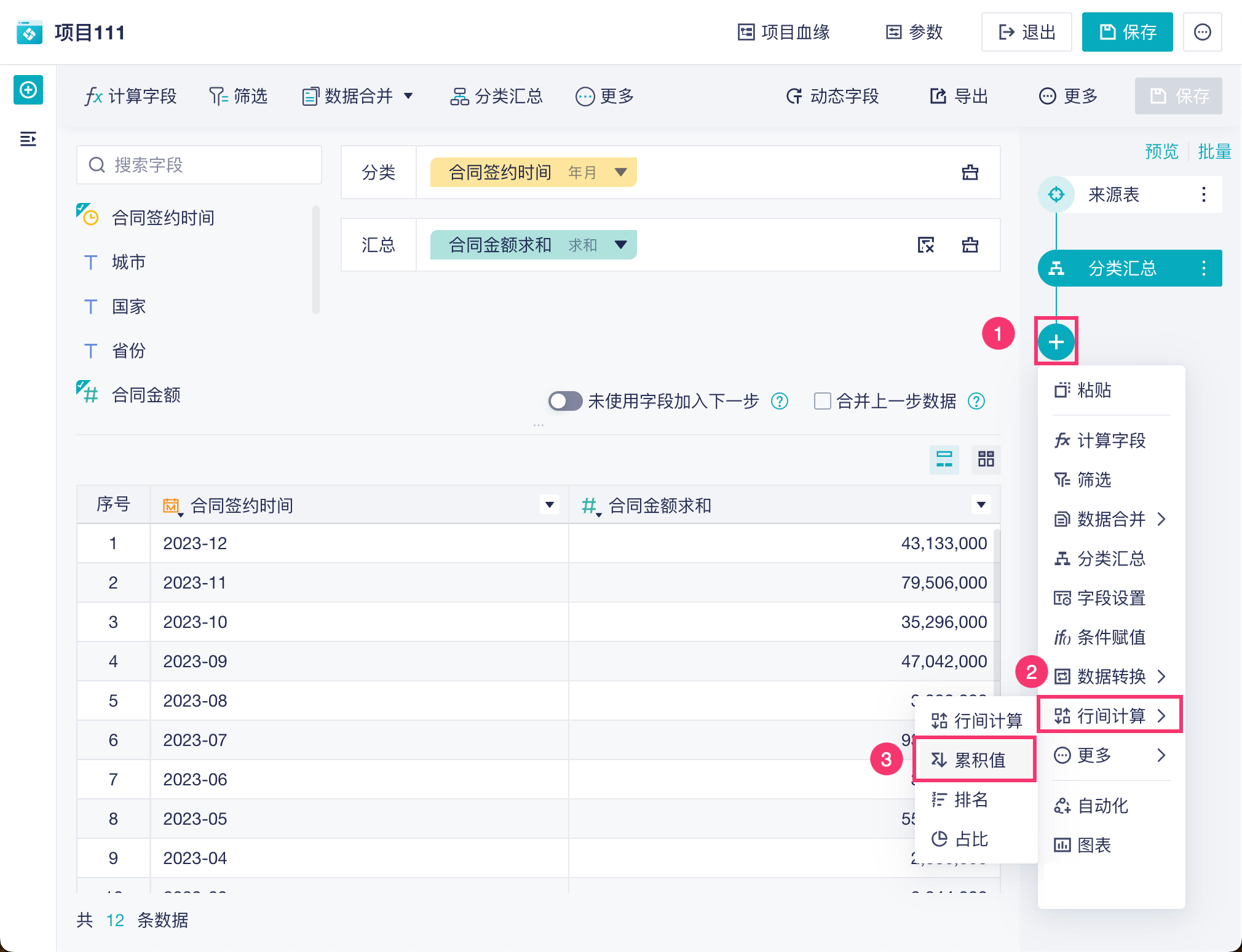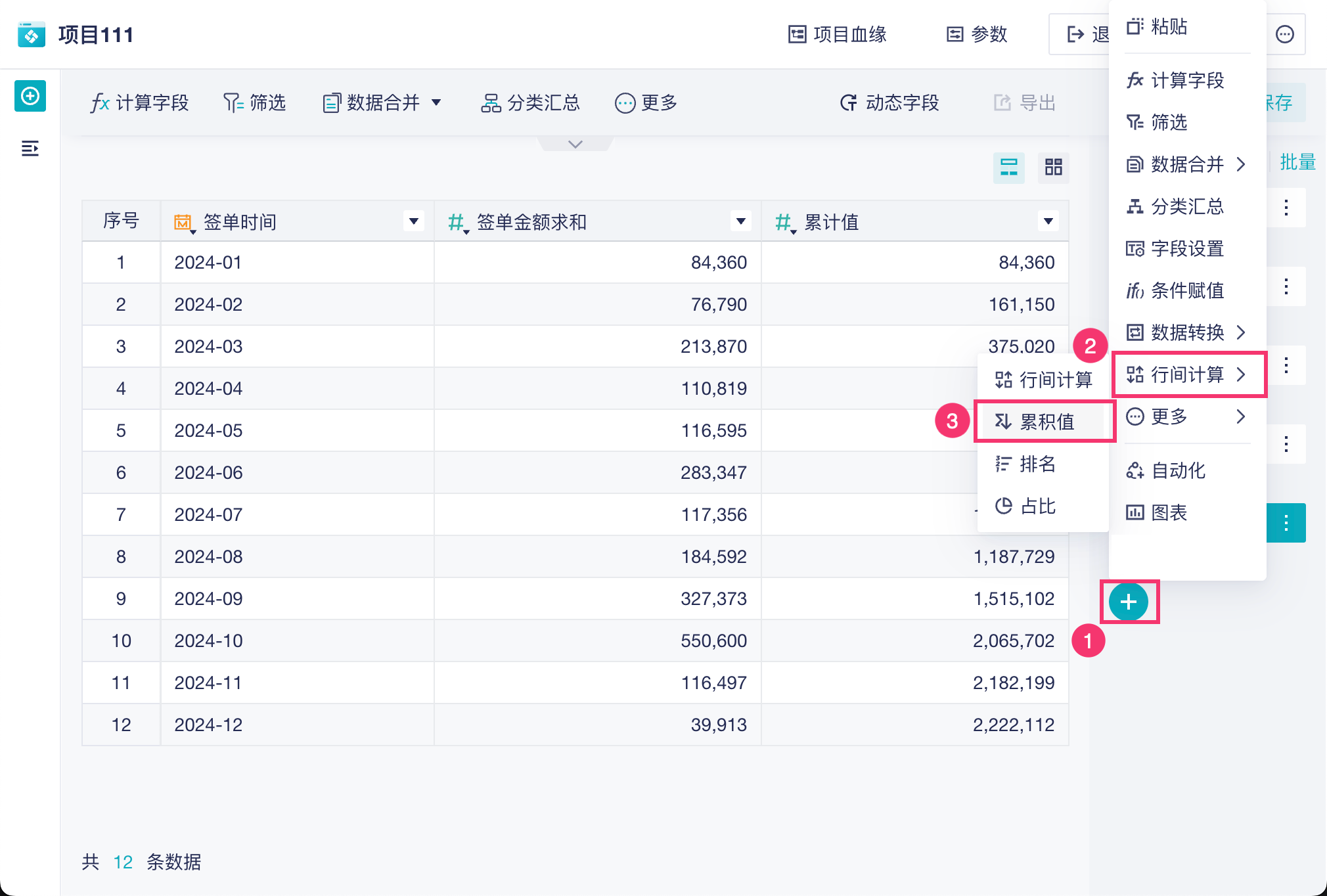 点击「+>行间计算>累积值」,可以新增一个字段进行累积值计算,或者将指定字段替换为累计值计算结果,如下图所示: