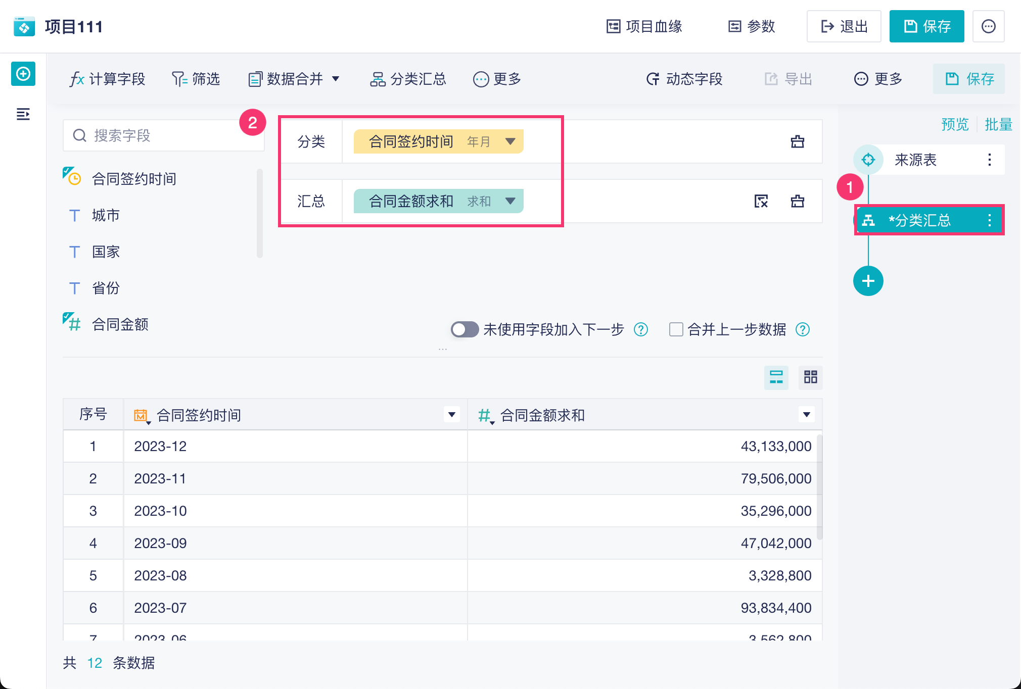1)先添加一个「分类汇总」 步骤,汇总出每月的合同金额总和、回款金额总和。如下图所示: