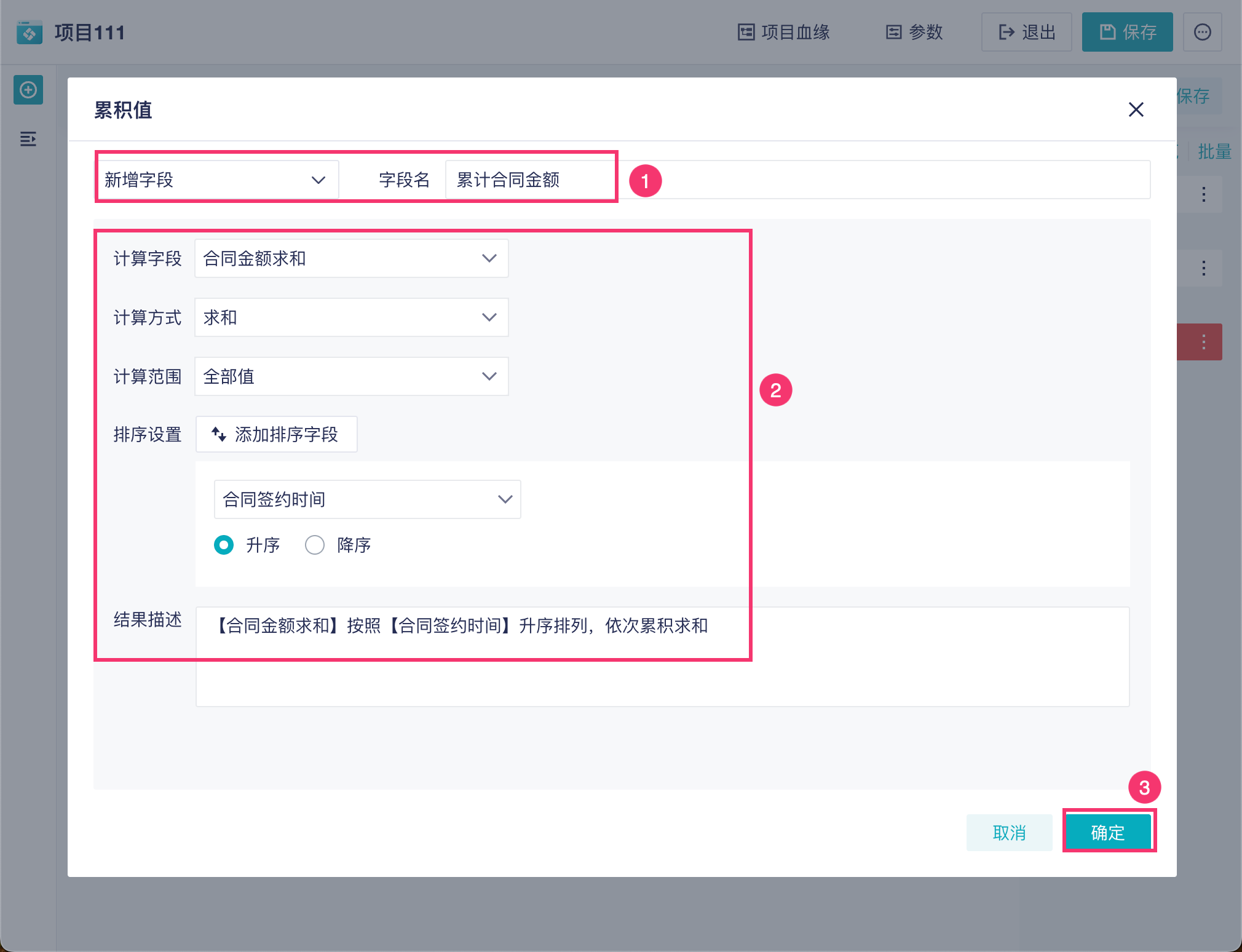| 计算字段 | 对哪个字段进行累积值计算。 比如本文示例是要计算累积合同金额,那么计算字段选择「合同金额」字段。 |